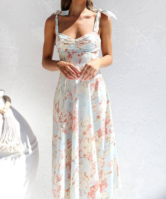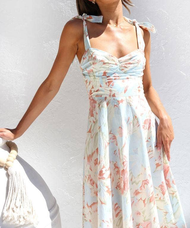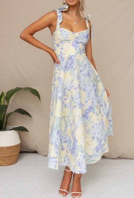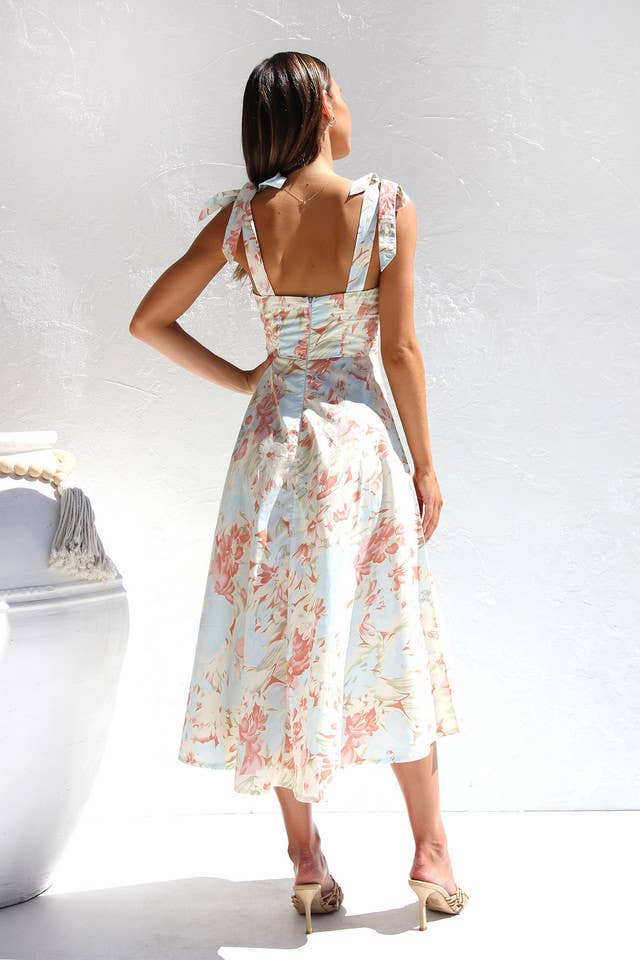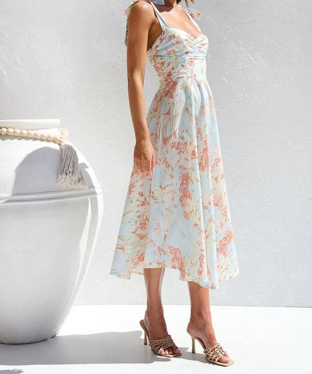 Pastel Floral Sweetheart Midi Dress: Blue / S