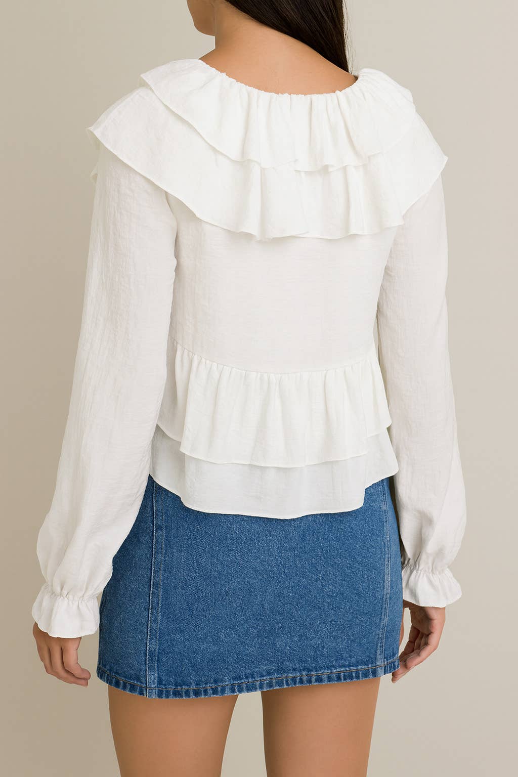 LONG SLEEVE V-NECK RUFFLE DETAIL CROP BLOUSE: White / XS