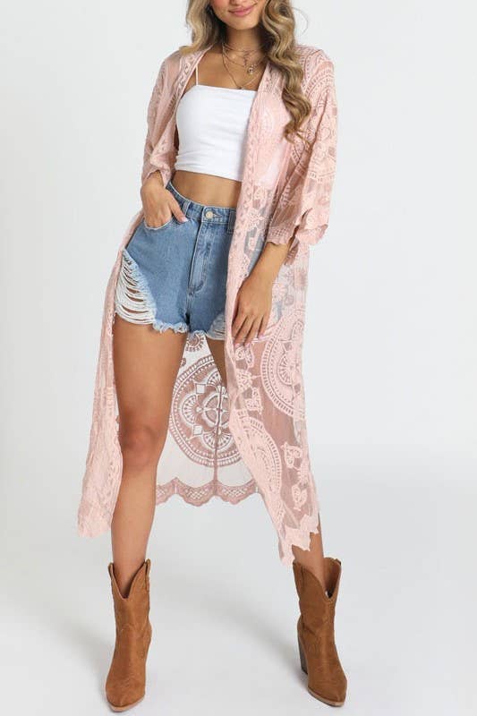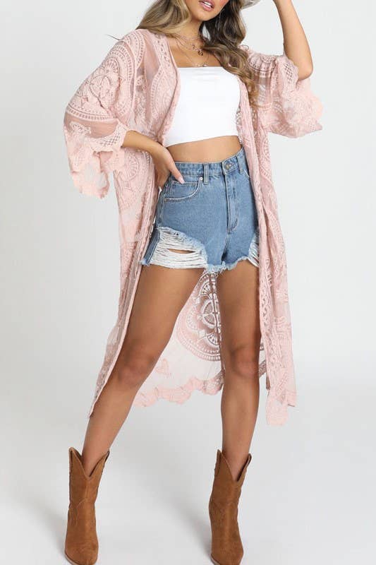 Pink Boho Crochet Lace Beach Cover Up Kimono Long Cardigan