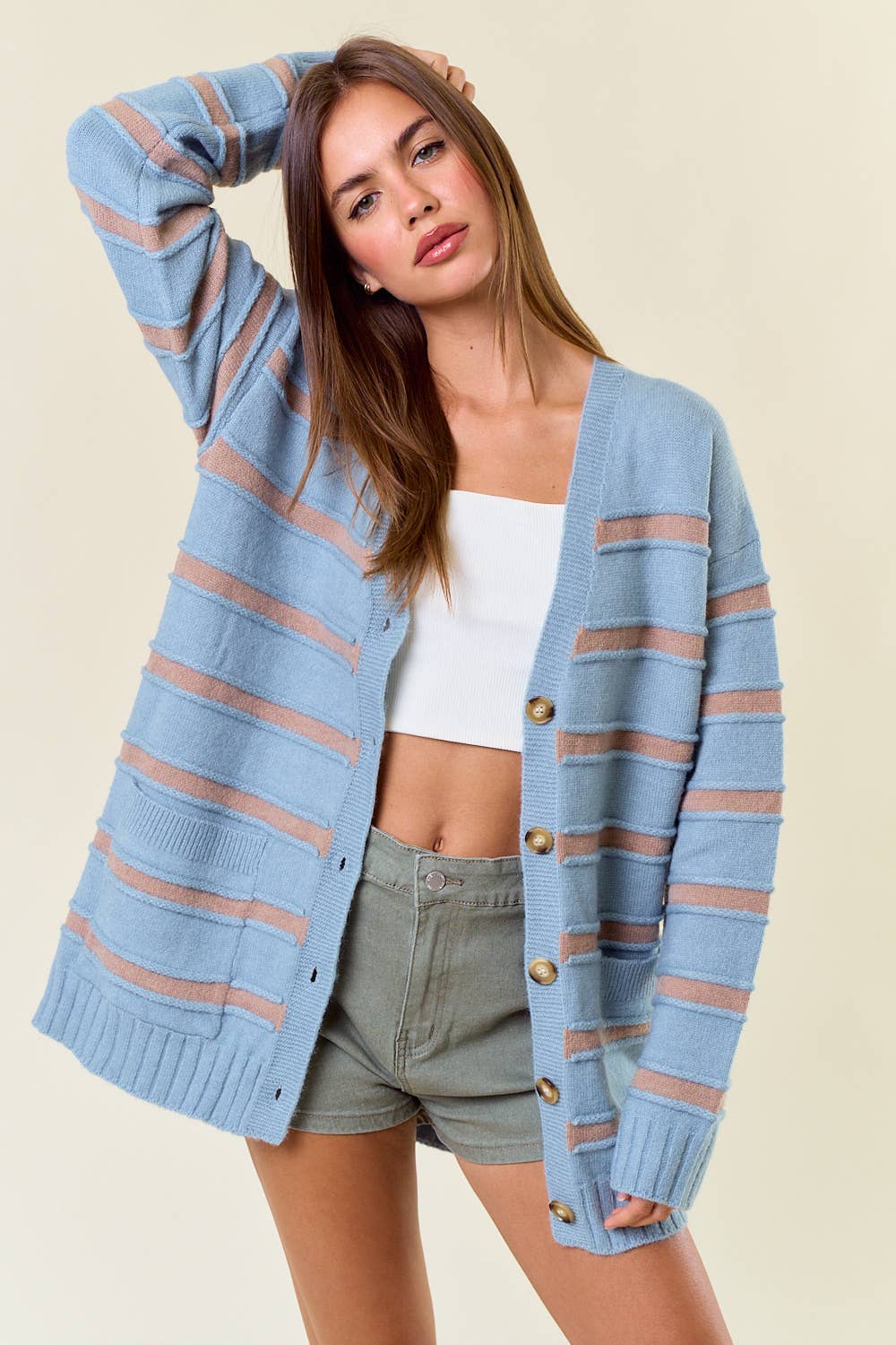 Striped Front Button Closure Sweater Cardigan - 10616J: DUSTY BLUE / L