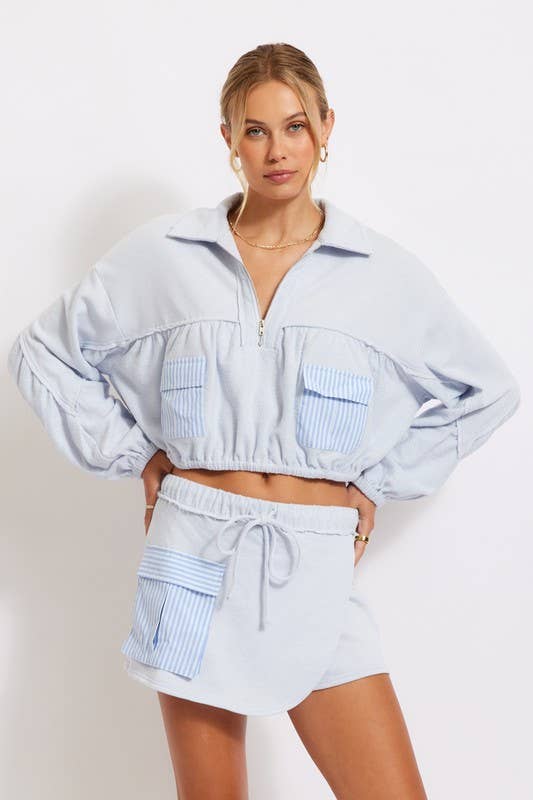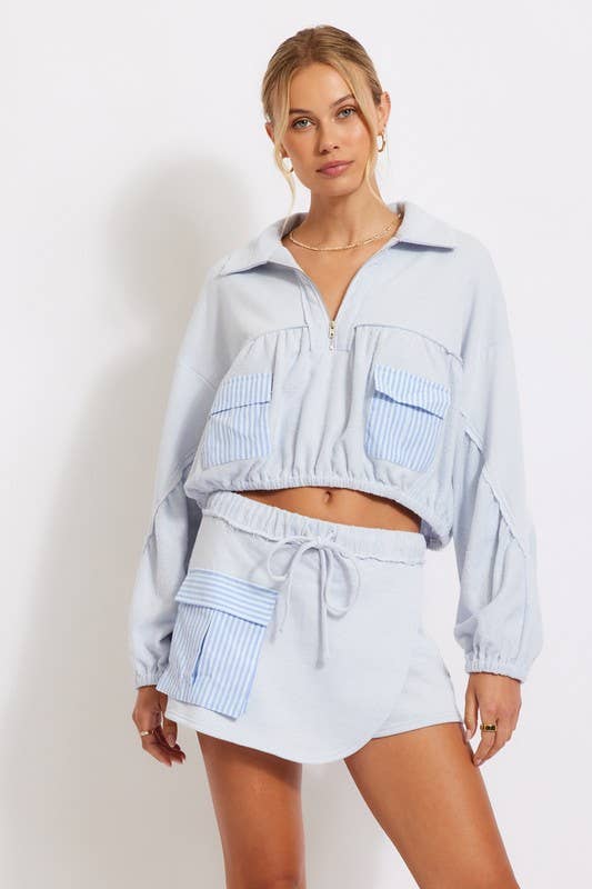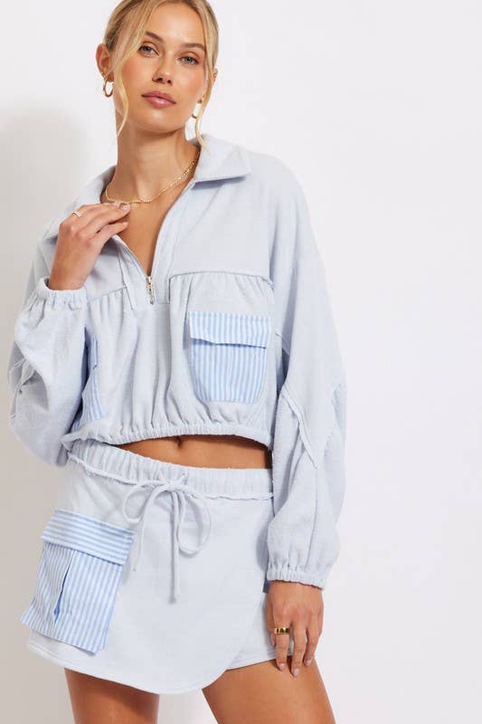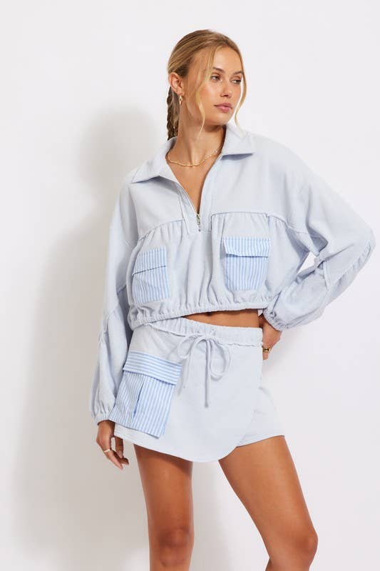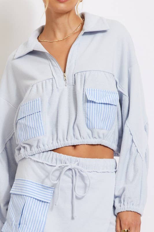 Cotton Terry Top With Striped Patch Pocket: Light Blue