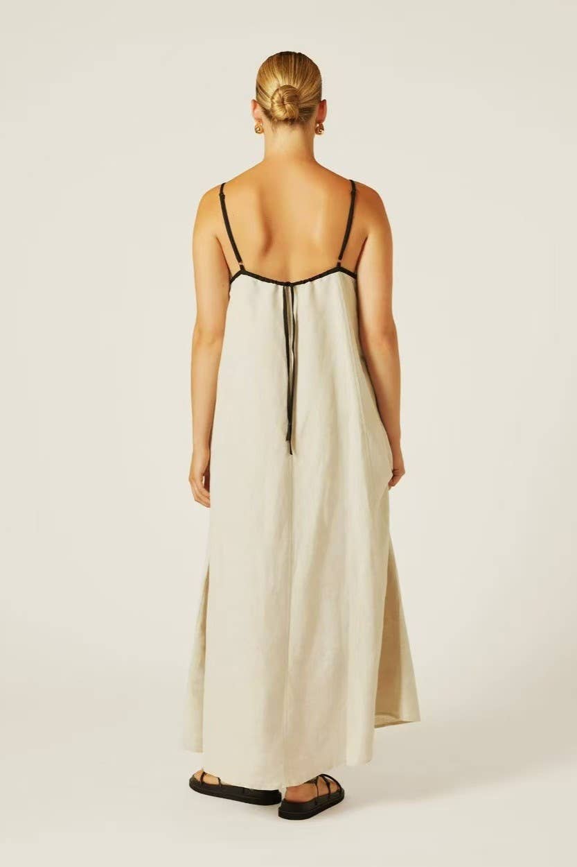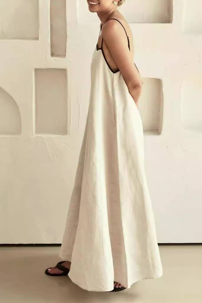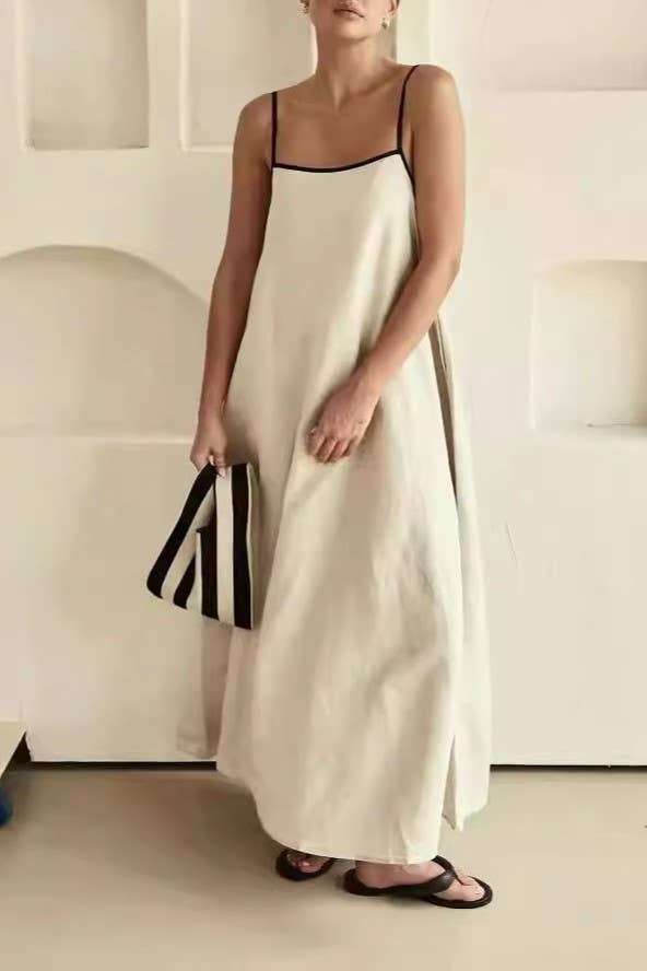 Chic Beige Linen with Black Spaghetti straps Maxi Dress