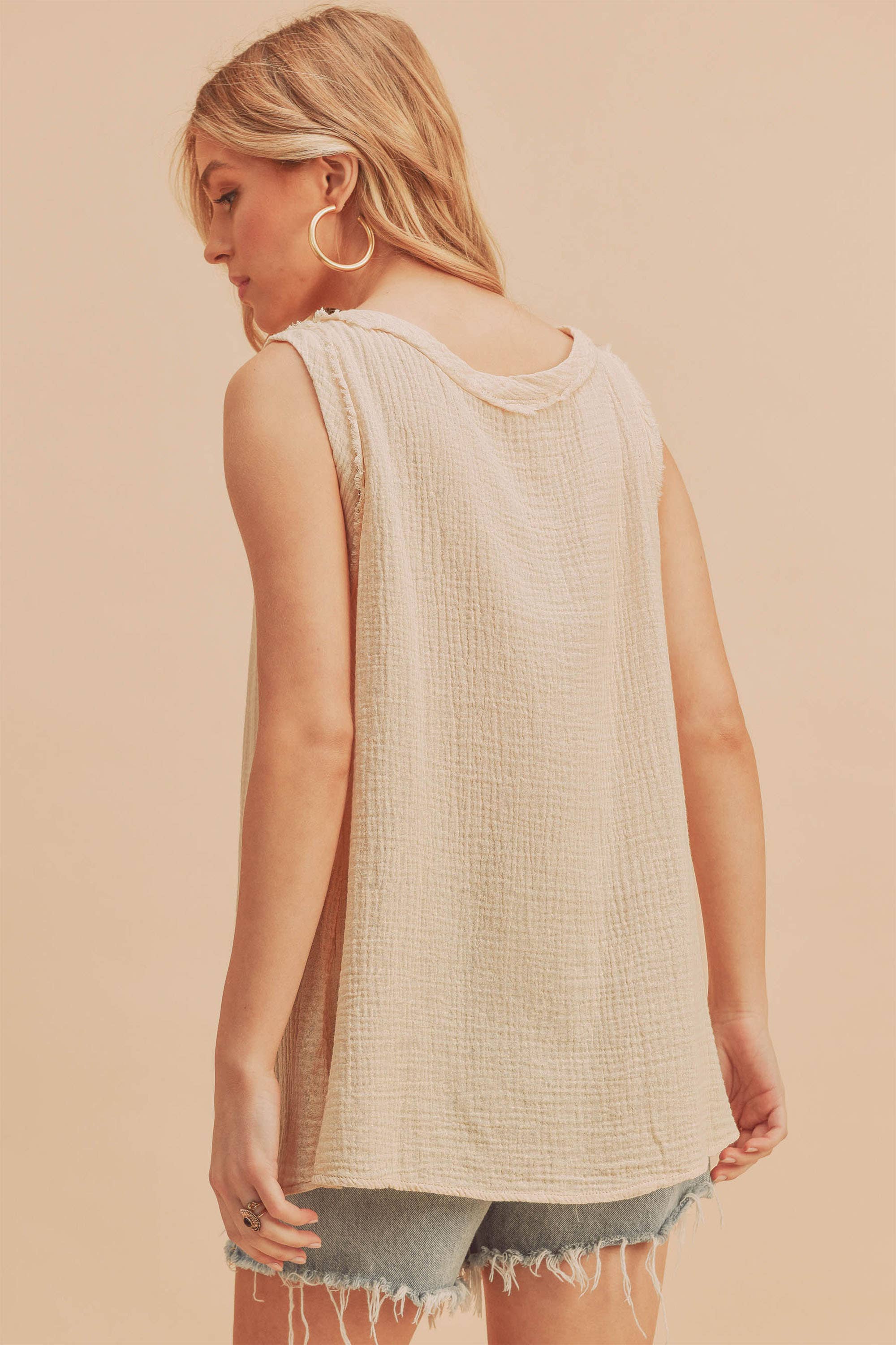 The Nasia Stay cool and cozy in the Sandstone Nasia Cotton Tank, crafted from our favorite soft cotton gauze. Its playful v-neckline and charming raw edge details add a breezy vibe perfect for those cooler days and nights. Effortless style meets comfort in this must-have tank!