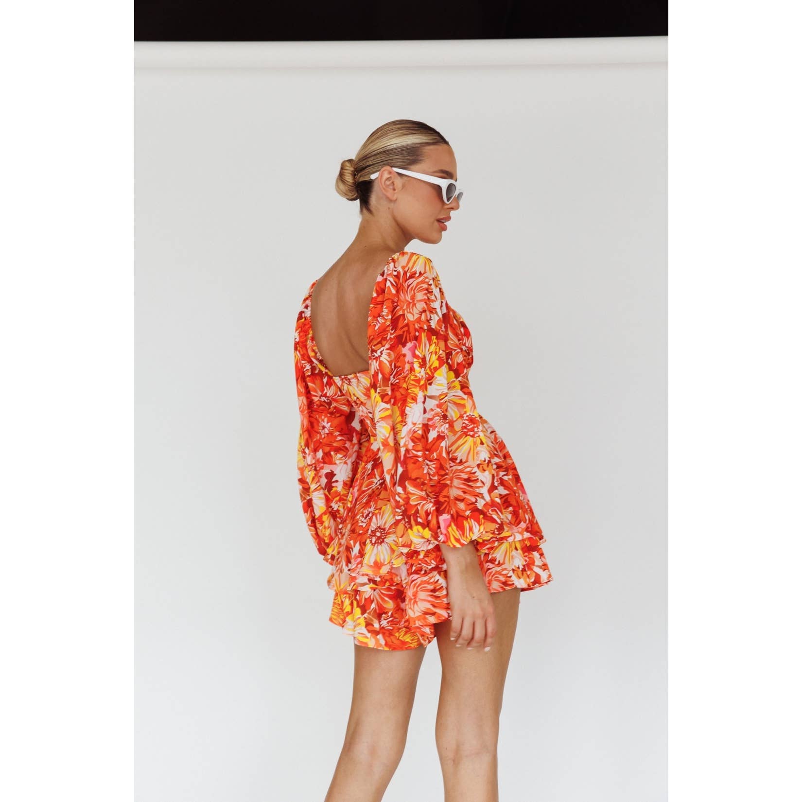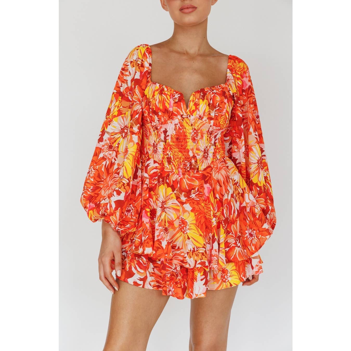 BALLOON LONG SLEEVES SHIRRED WAIST V NECKLINE FLORAL PRINT ROMPER