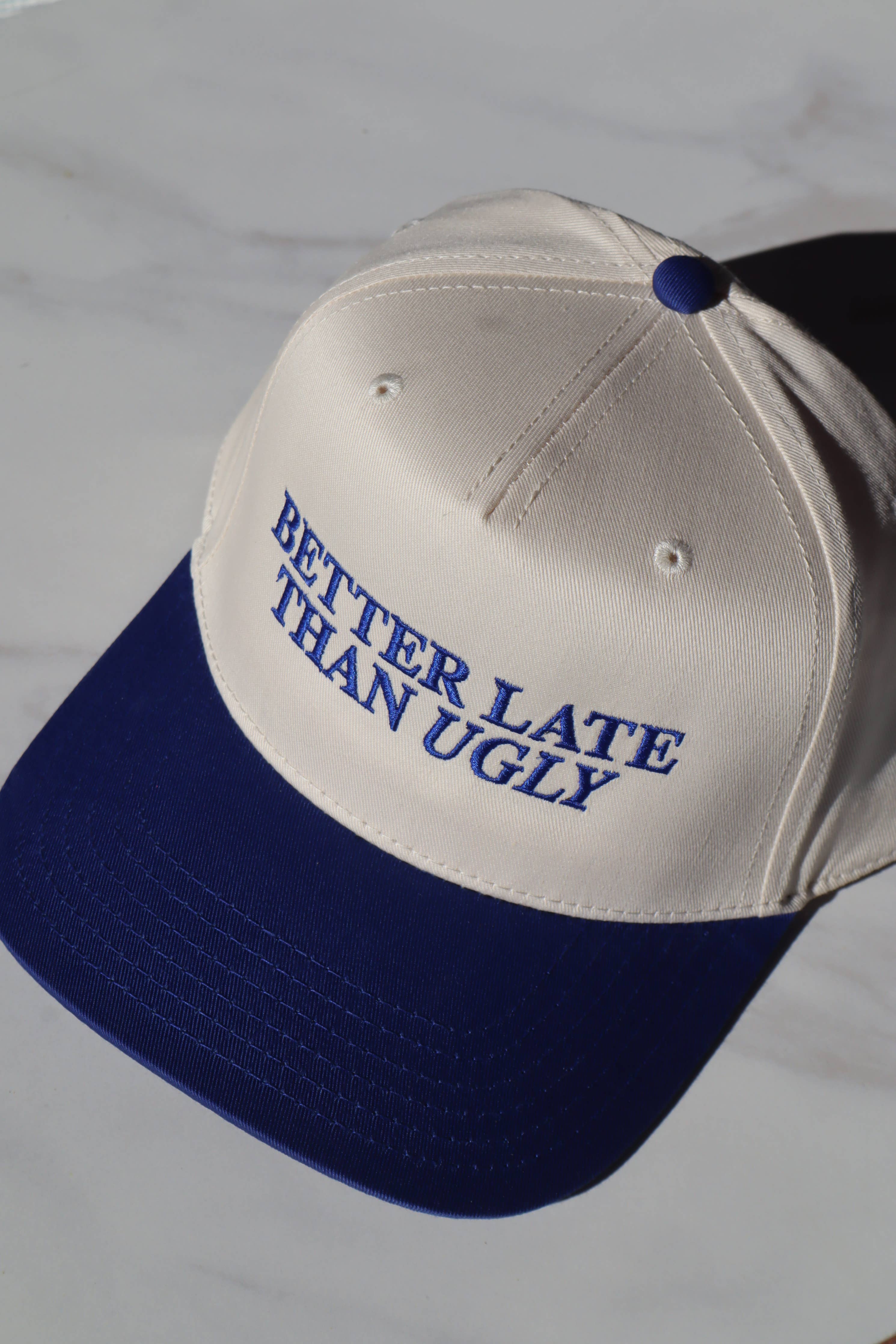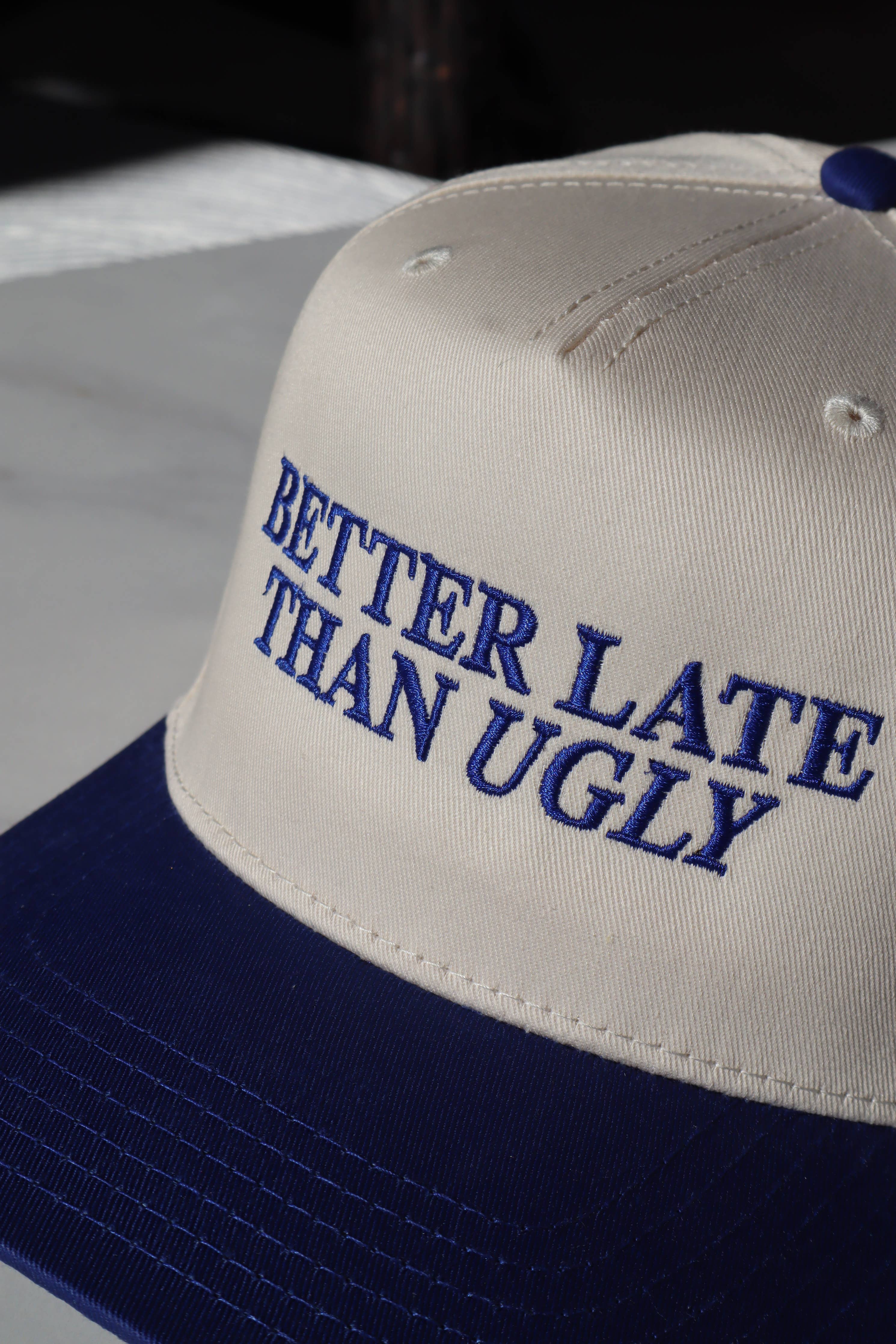 Never sacrifice style for speed with this "Better Late Than Ugly" embroidered trucker hat. Whether you're running late or just fashionably on time, this hat has you covered—literally. It's the perfect mix of comfort and attitude. Throw it on and go, because looking good is always worth the wait!