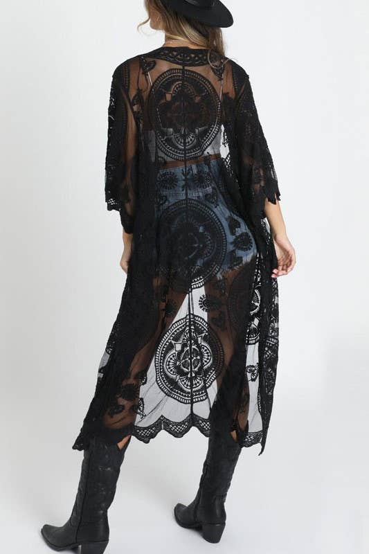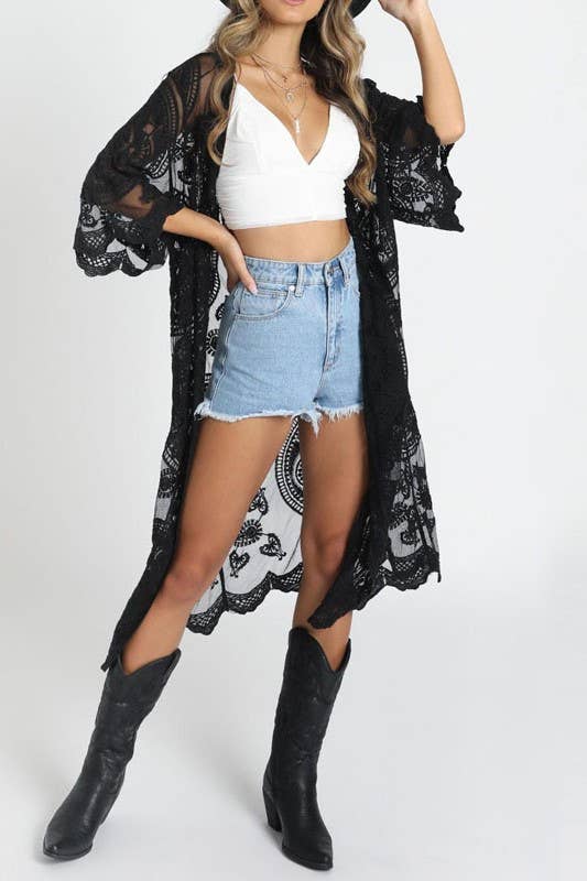 Black Boho Crochet Lace Beach Cover Up Kimono Long Cardigan