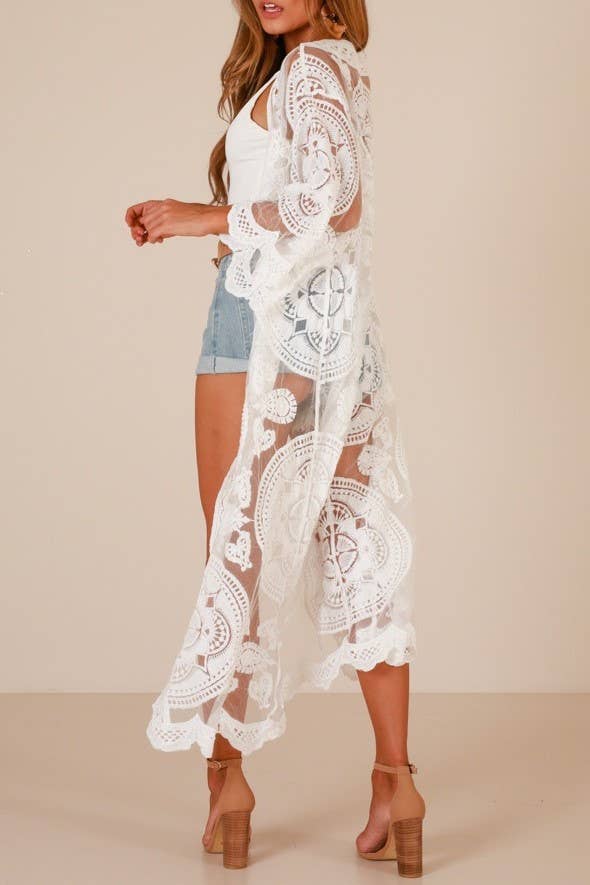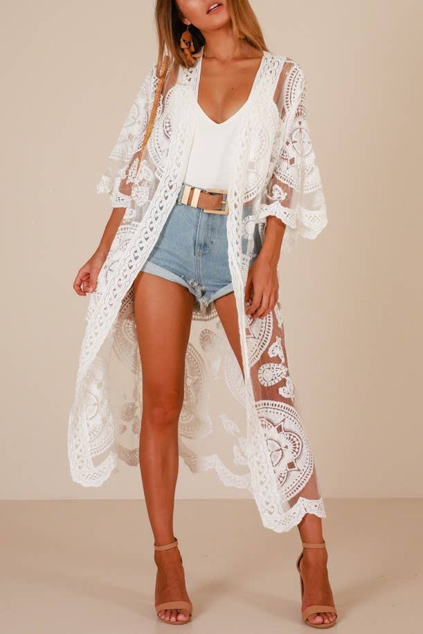 White Boho Crochet Lace Beach Cover Up Kimono Long Cardigan