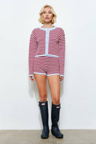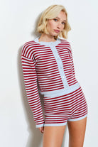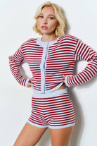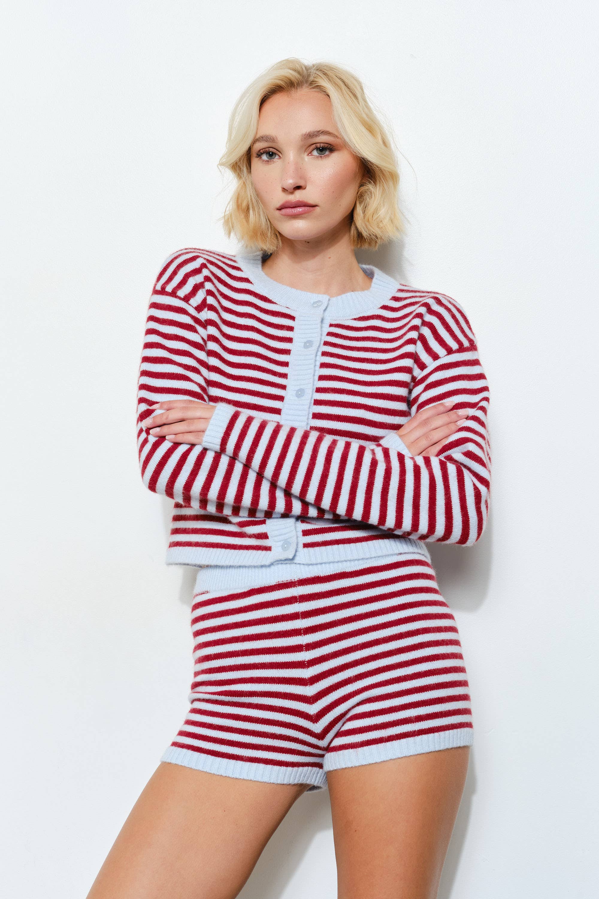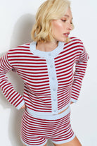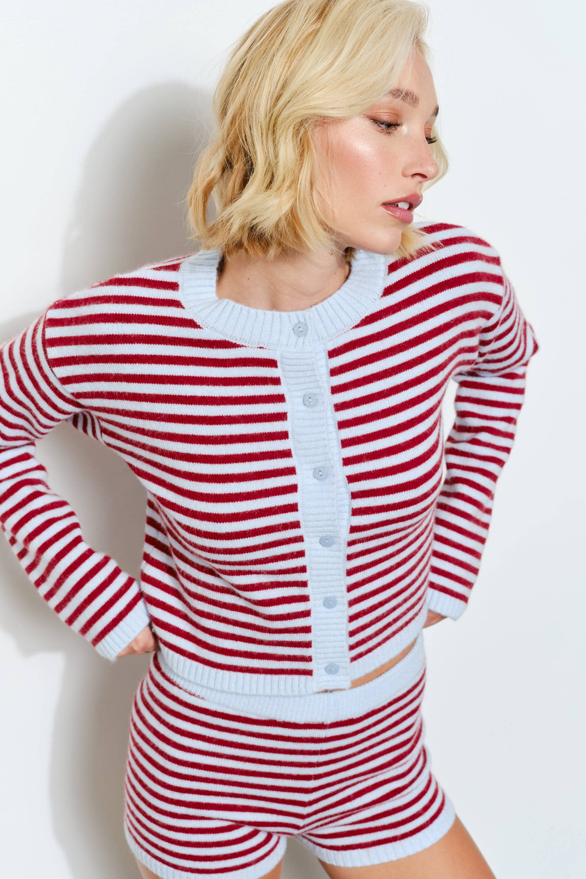 Keywords: striped knit cardigan, button up cardigan, cozy layering piece, women’s knit sweater, matching cardigan set, trendy lounge cardigan, wholesale women’s fashion, playful striped cardigan