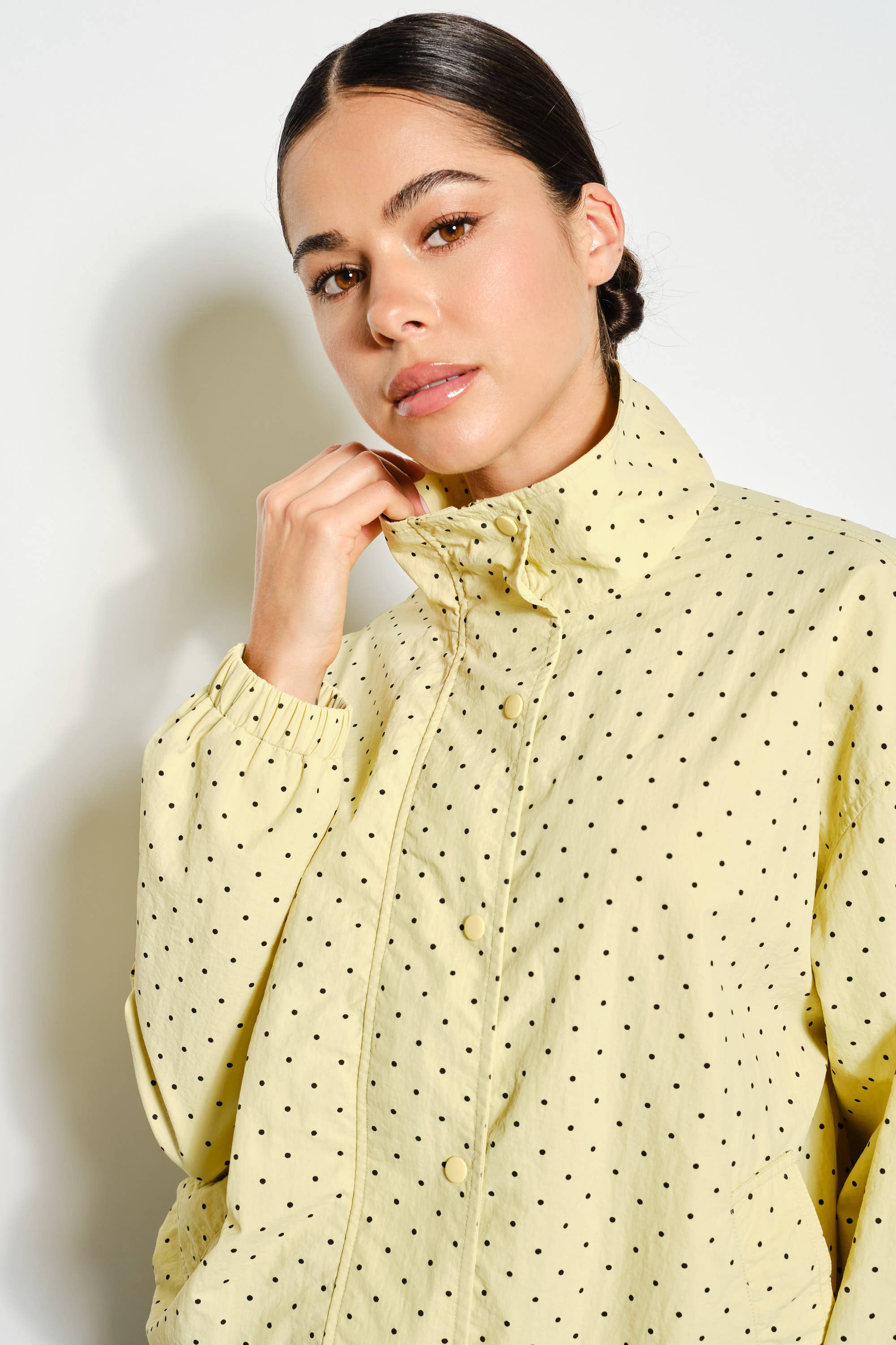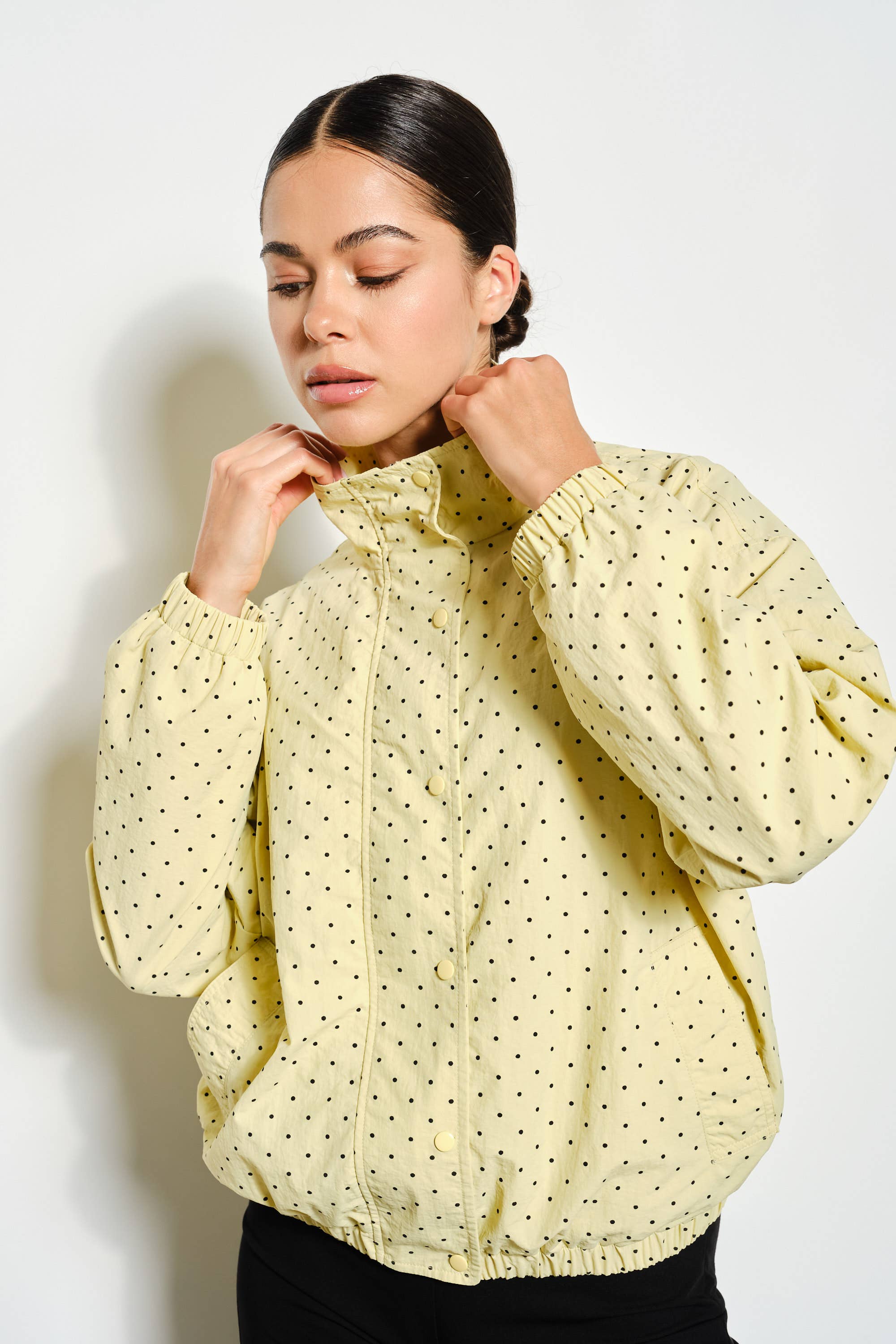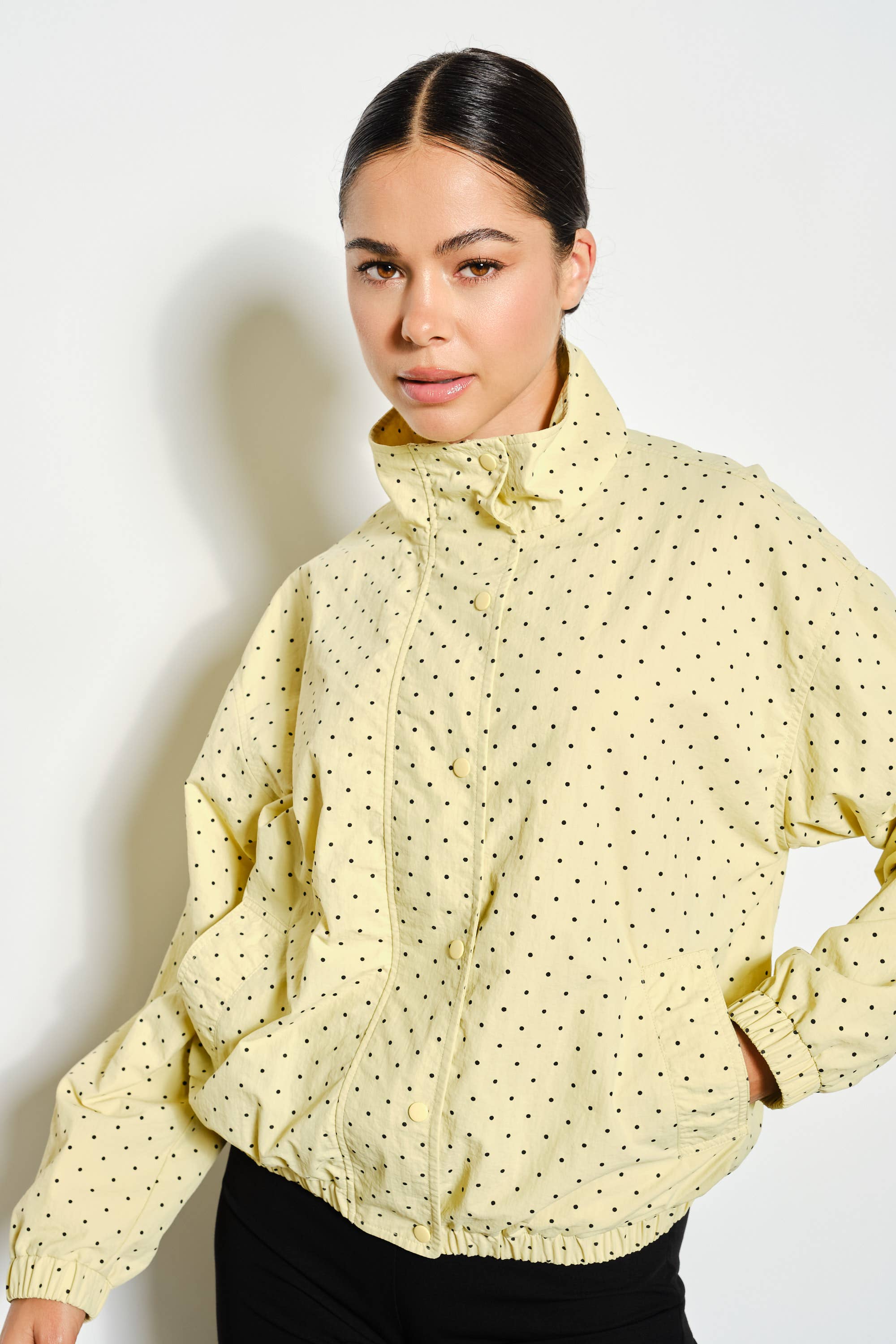 Stylish polka dot windbreaker with zipper and snap button closures for easy layering. Features elastic cuffs and hem for a secure fit, practical pockets, and lightweight lining perfect for breezy days. Versatile enough for any season, this playful jacket adds personality to your everyday wardrobe.