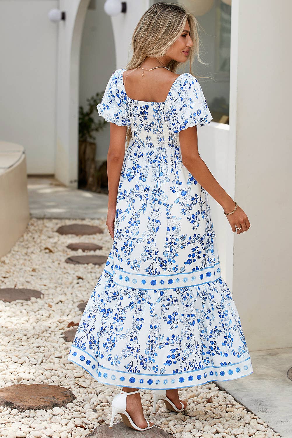 Sky Blue and White Floral Square Neck Bubble Sleeve High Waist Dress