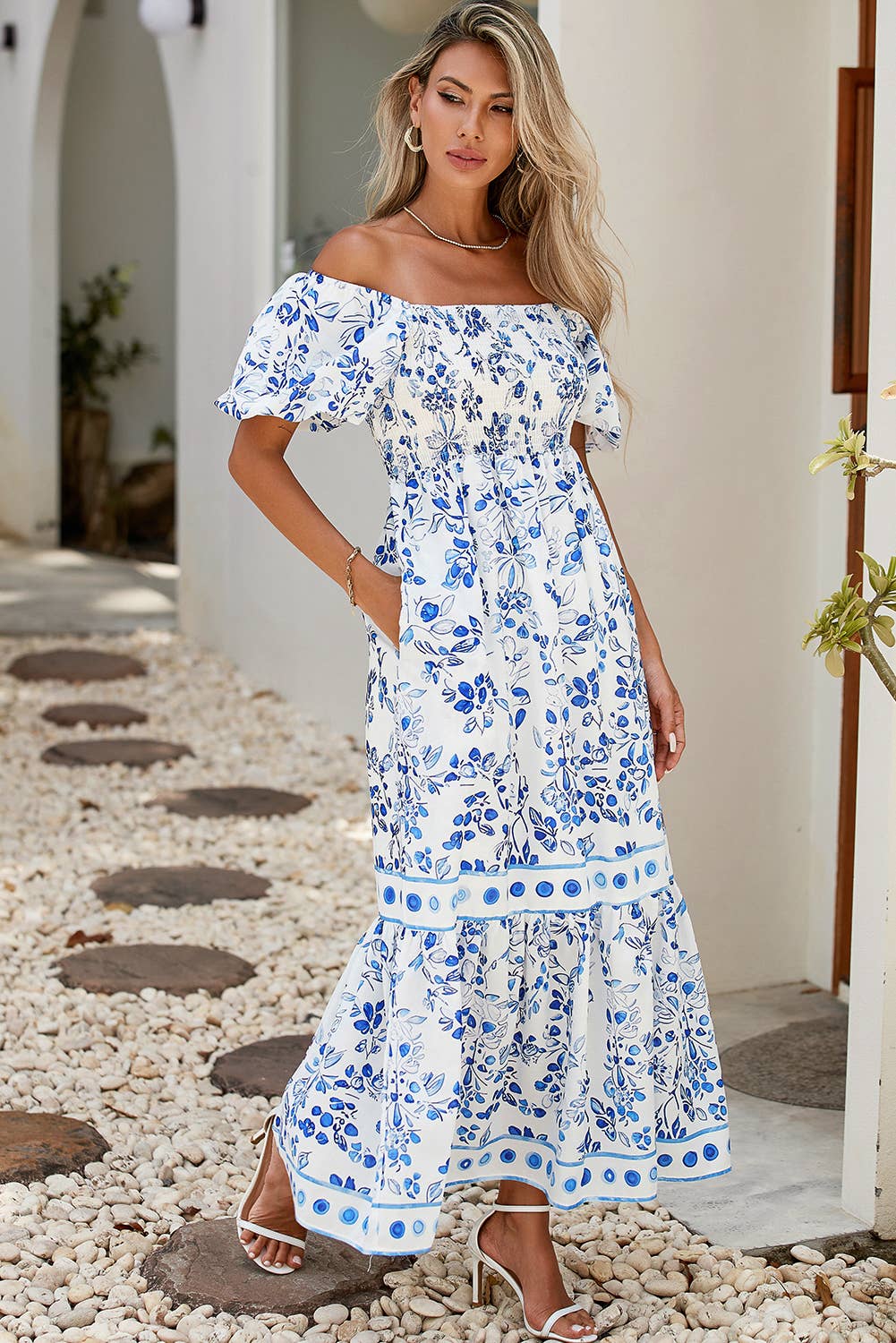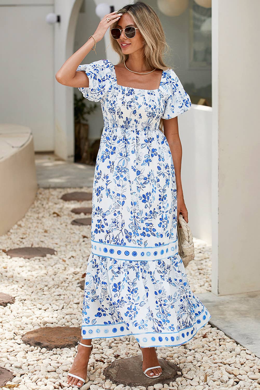 Step into sunshine with this playful floral maxi dress featuring a charming square neckline and whimsical bubble sleeves. The high waist design enhances your silhouette while the flowy fabric keeps you dancing through the day in comfort and style. Perfect for breezy afternoons and garden parties, this sky blue dress brings a fresh, fun vibe to your wardrobe.