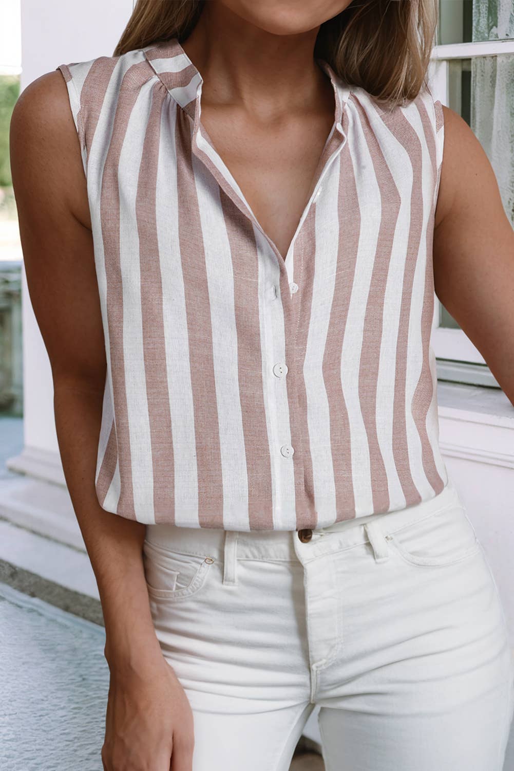 Khaki and White Stripe Casual Button Down Sleeveless Shirt