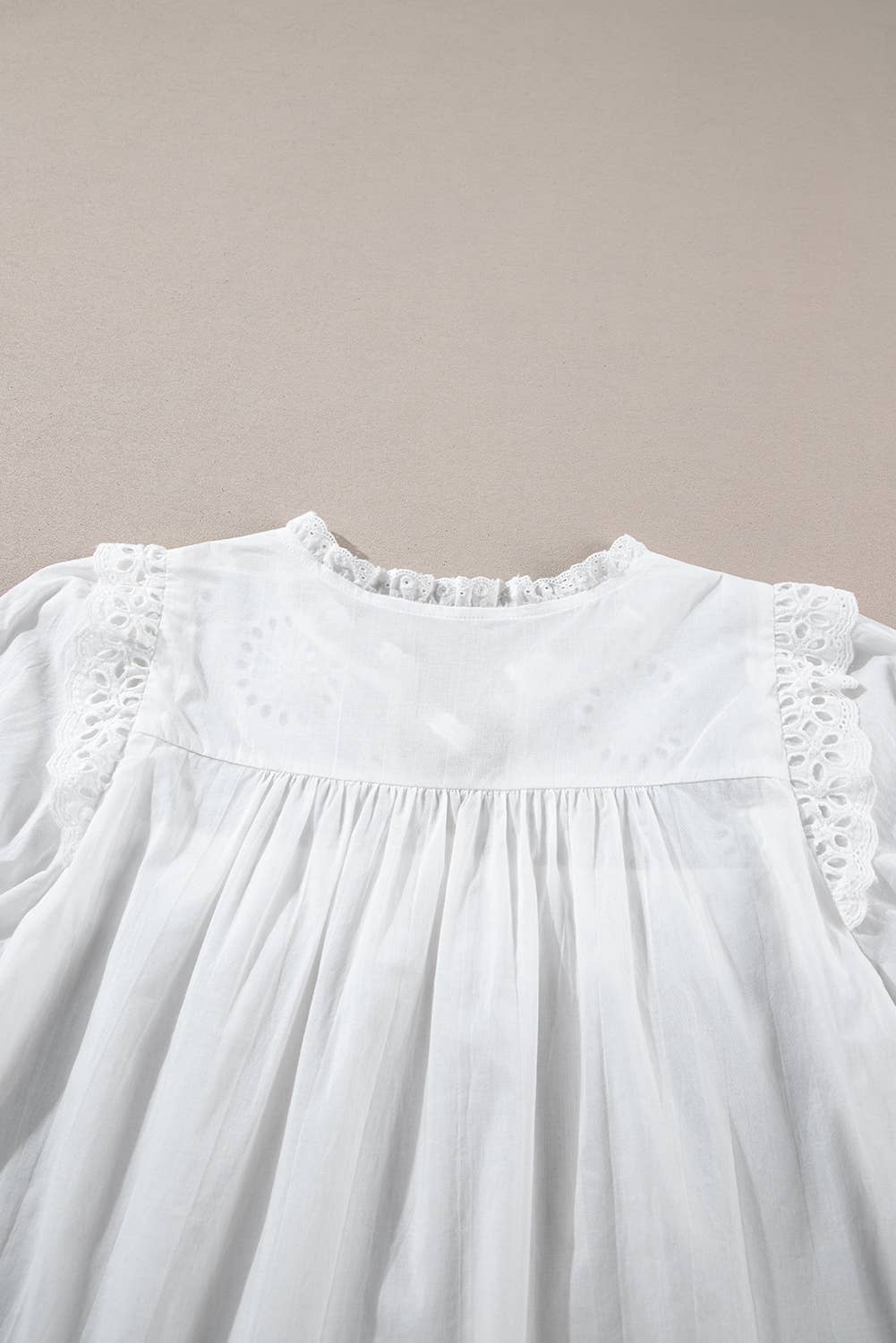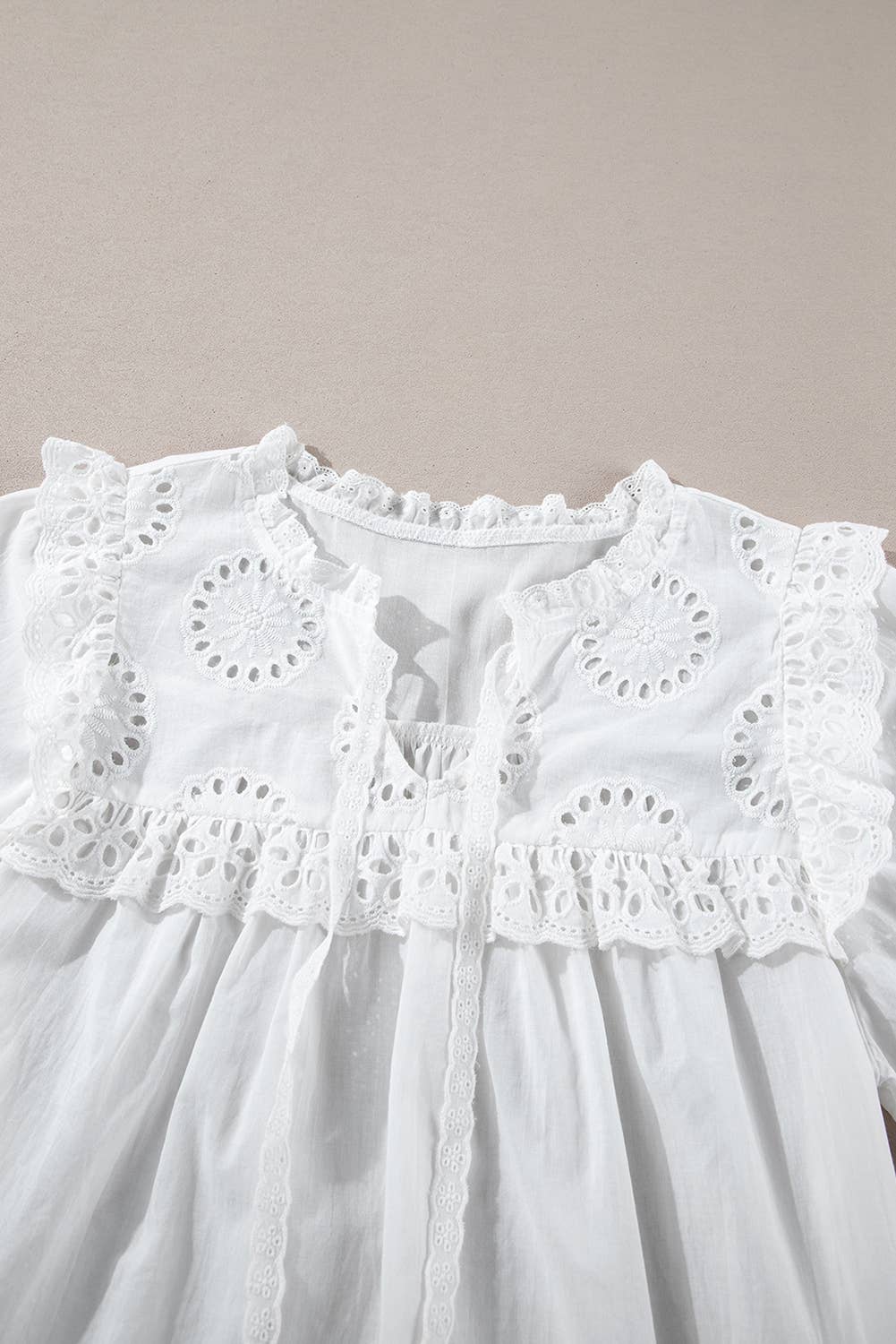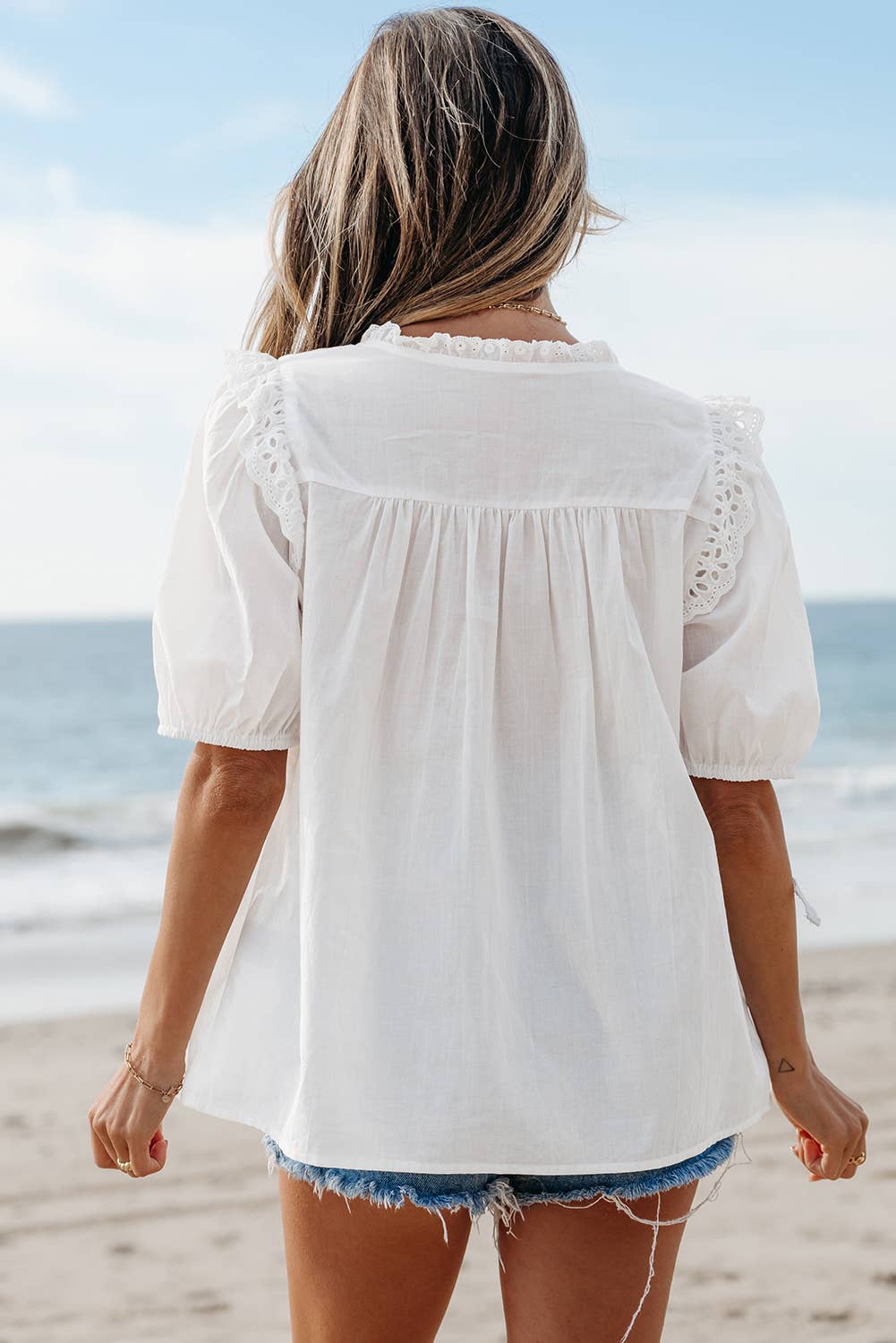 White Cotton Paisley and Embroidered Lace Tie Neck Short Sleeve Blouse