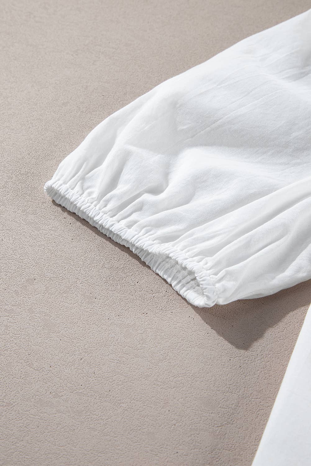 This white cotton blouse combines playful paisley patterns with delicate embroidered lace for a fresh, breezy look. The tie-neck detail adds a flirty touch, while the short blousy sleeves keep it light and airy—perfect for sunny days or layering up with your favorite jacket. Embrace effortless charm with this versatile piece that’s as fun to wear as it is to style.
