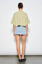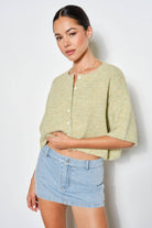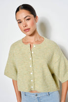 Keywords: short sleeve cardigan, button front knit, lightweight sweater, cozy women’s cardigan, sustainable knitwear, recycled fabric top, classic short sleeve sweater, stylish layering piece, trendy knit cardigan, everyday women’s fashion