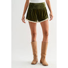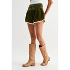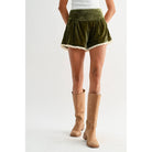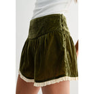Soft velvet shorts with a high waist, flattering fit, and delicate cream lace trim. The rich olive green hue and romantic details make these a standout piece for anyone seeking vintage-inspired style with modern comfort.