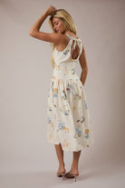BOAT NECK SLEEVELESS DROP WAIST MIDI DRESS: CREAM-MULTI / M