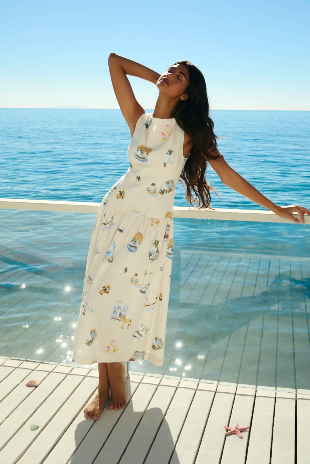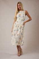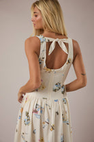BOAT NECK SLEEVELESS DROP WAIST MIDI DRESS: CREAM-MULTI / S