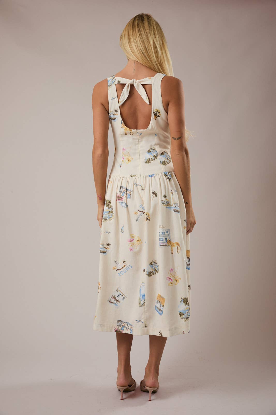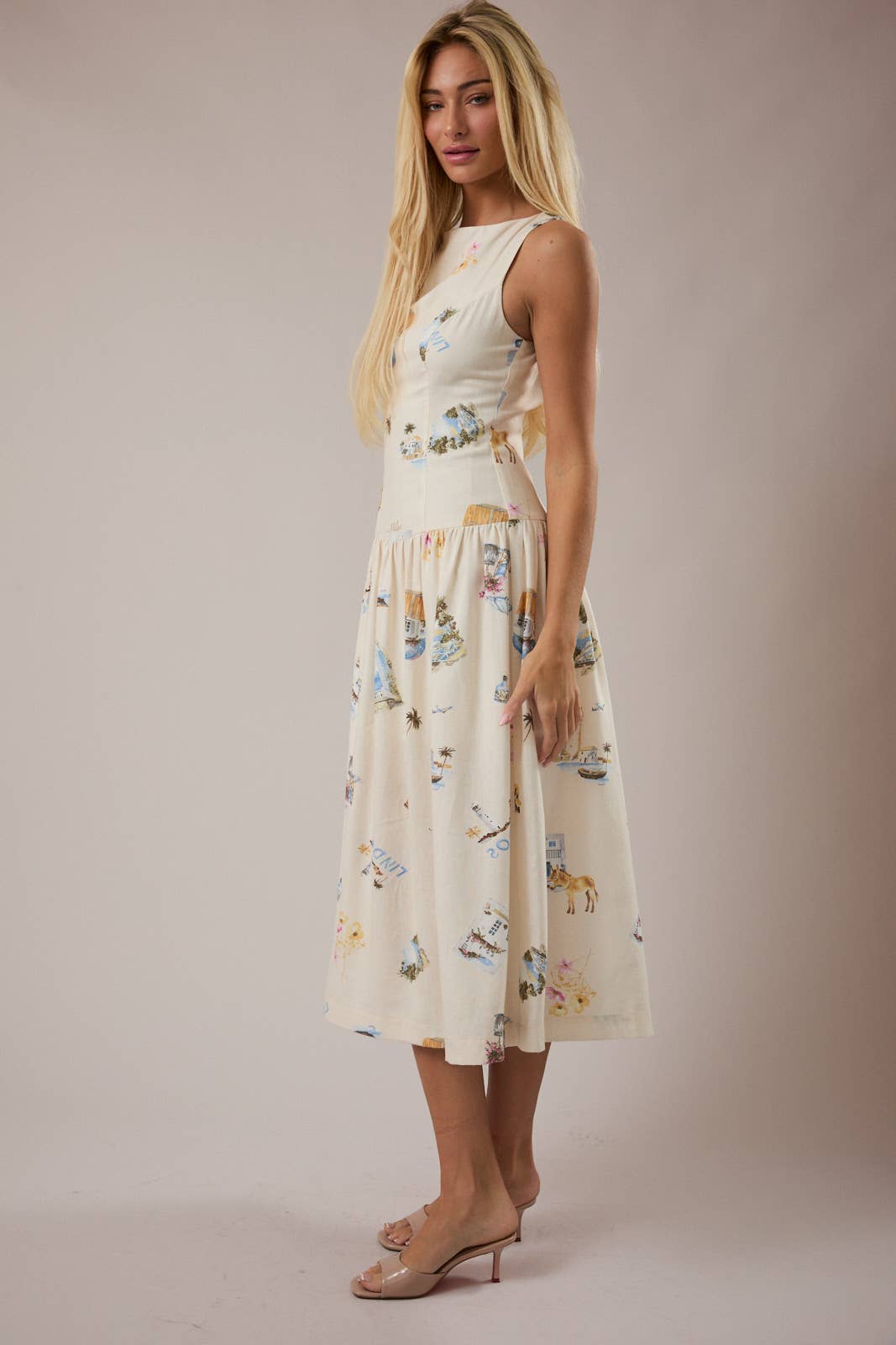 BOAT NECK SLEEVELESS DROP WAIST MIDI DRESS: CREAM-MULTI / XS