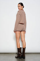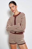 Keywords: striped knit cardigan, button up cardigan, cozy layering piece, women’s knit sweater, matching cardigan set, trendy lounge cardigan, wholesale women’s fashion, playful striped cardigan