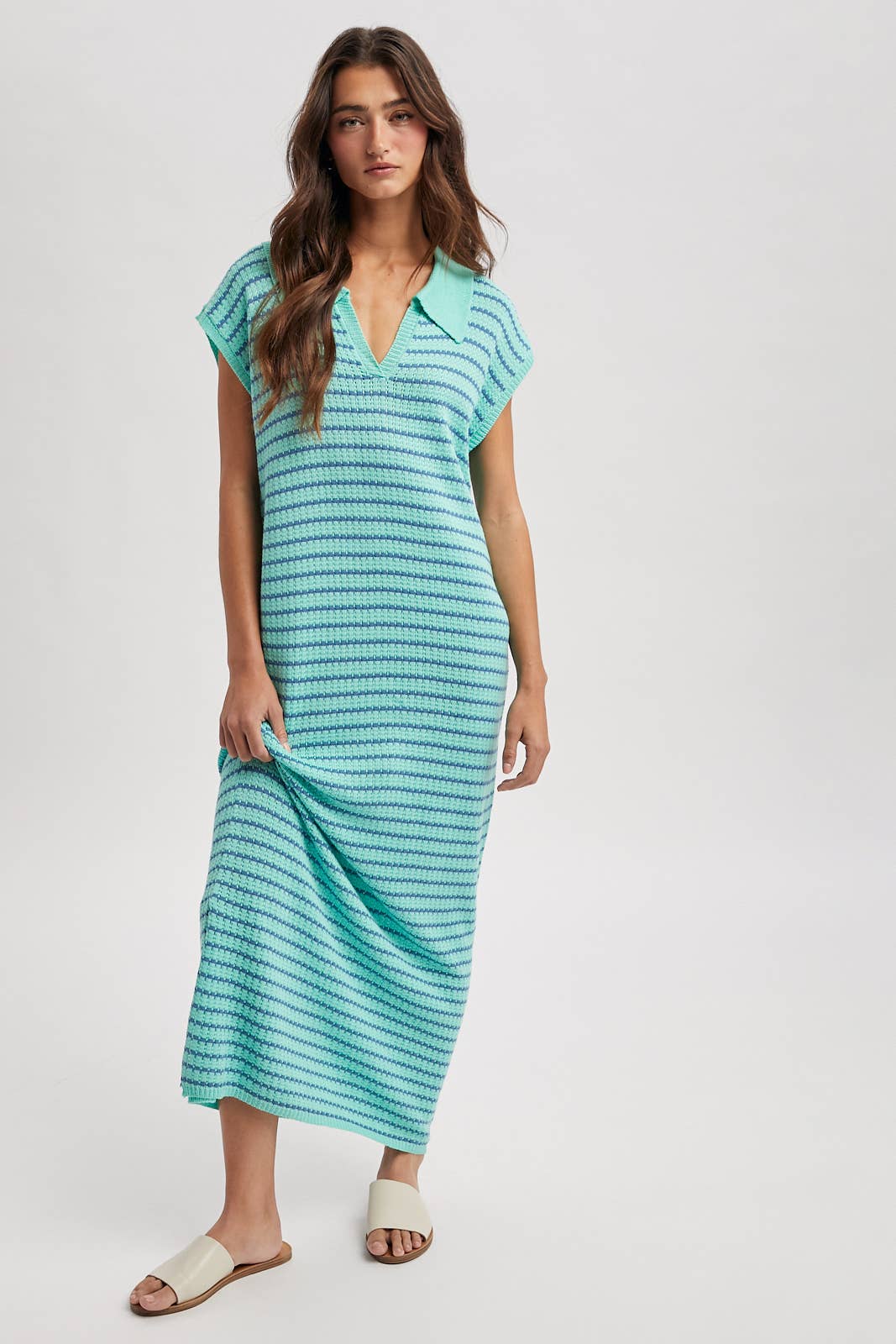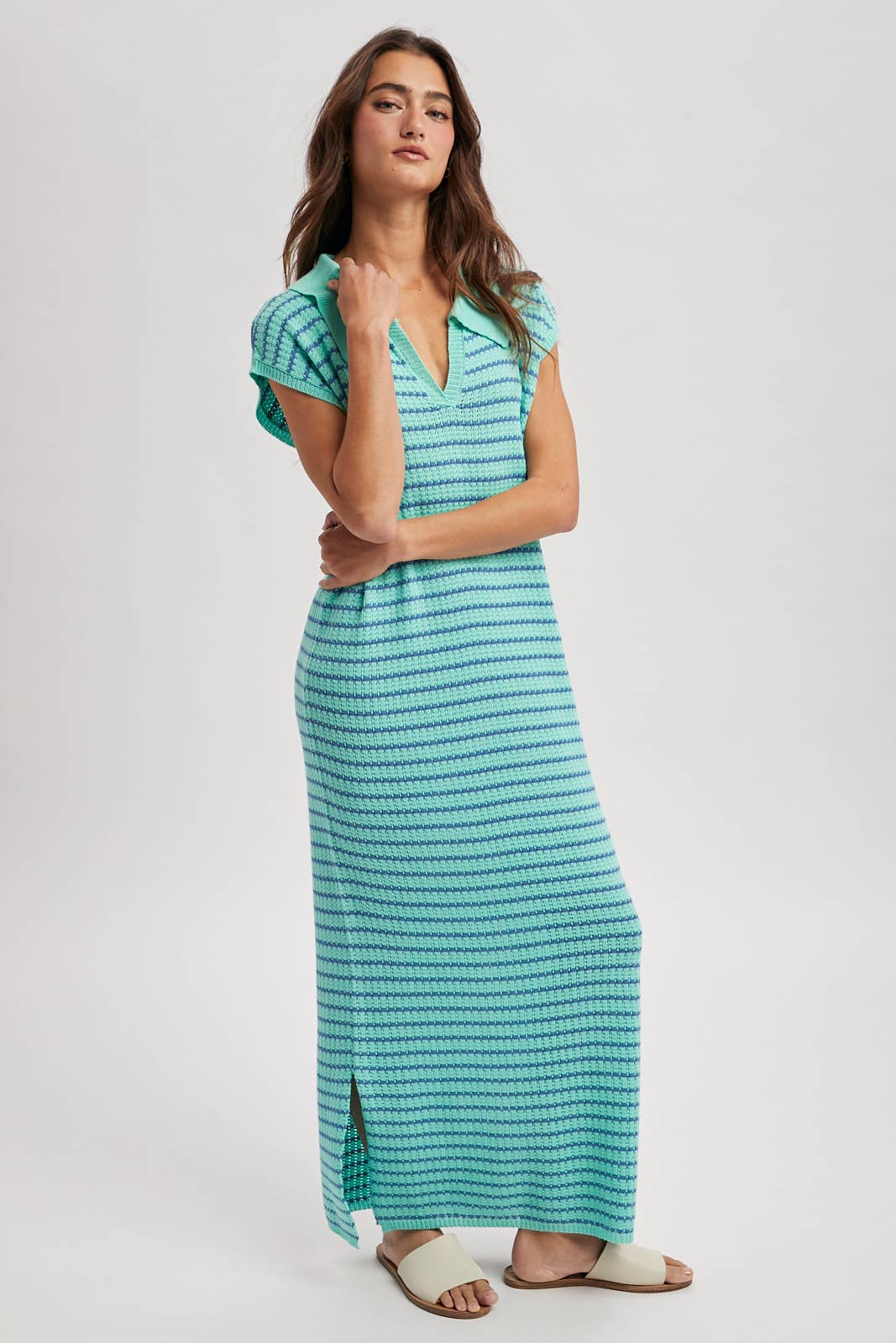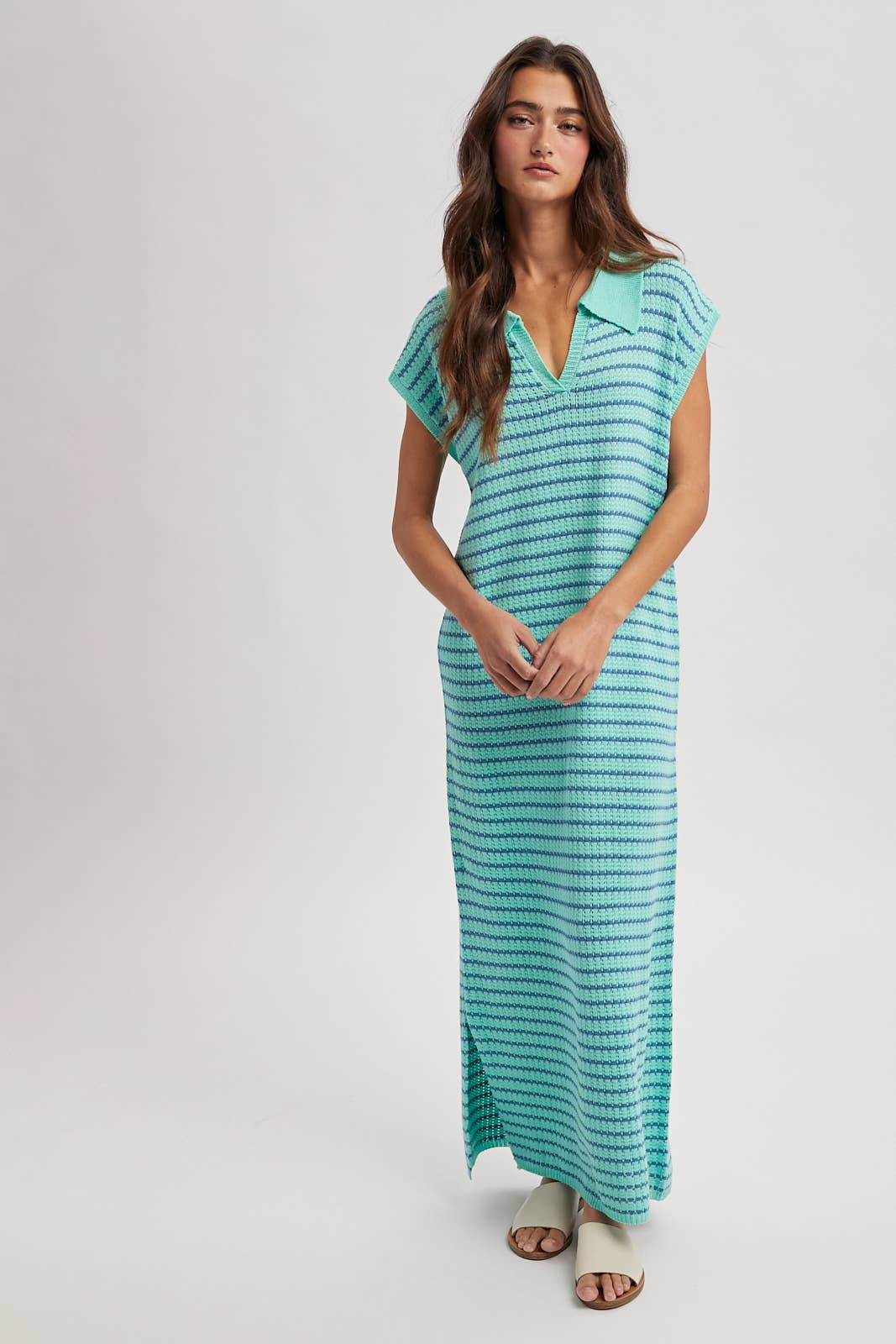 COLLARED STRIPE SWEATER MIDI DRESS / WL25-11902: MINT/BLUE / L