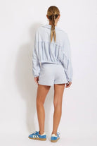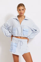 A cropped, cotton terry fabric top featuring striped patch pockets and a half zip.