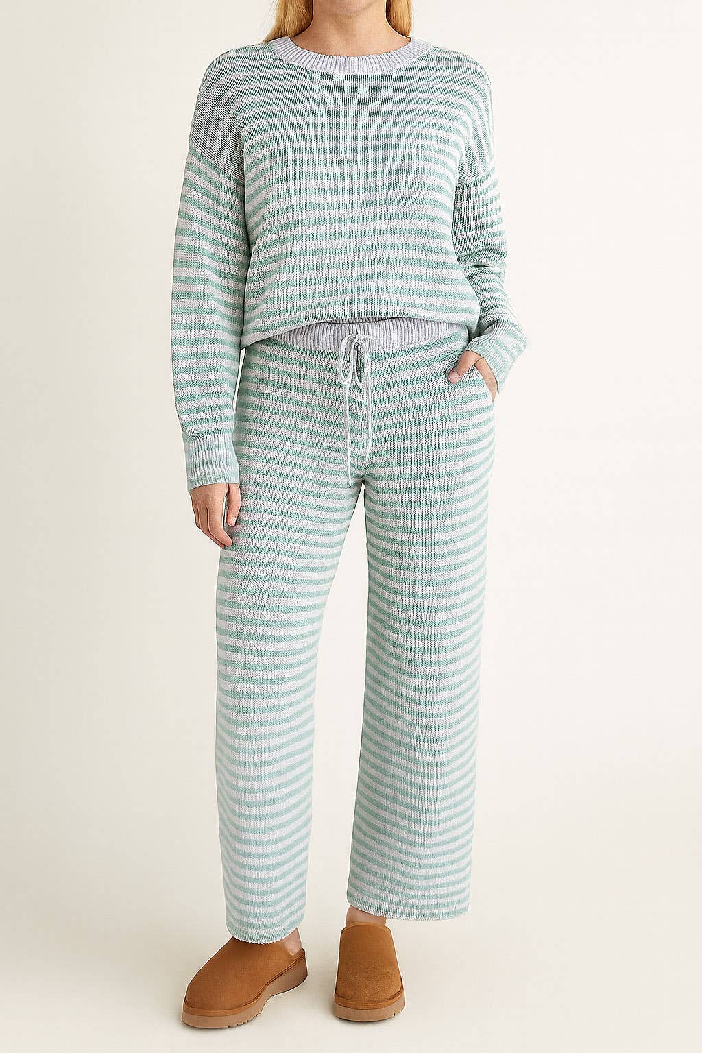 CREW NECK STRIPE SWEATER & WIDE LEG PANTS: GREEN-PINK STRIPE / M