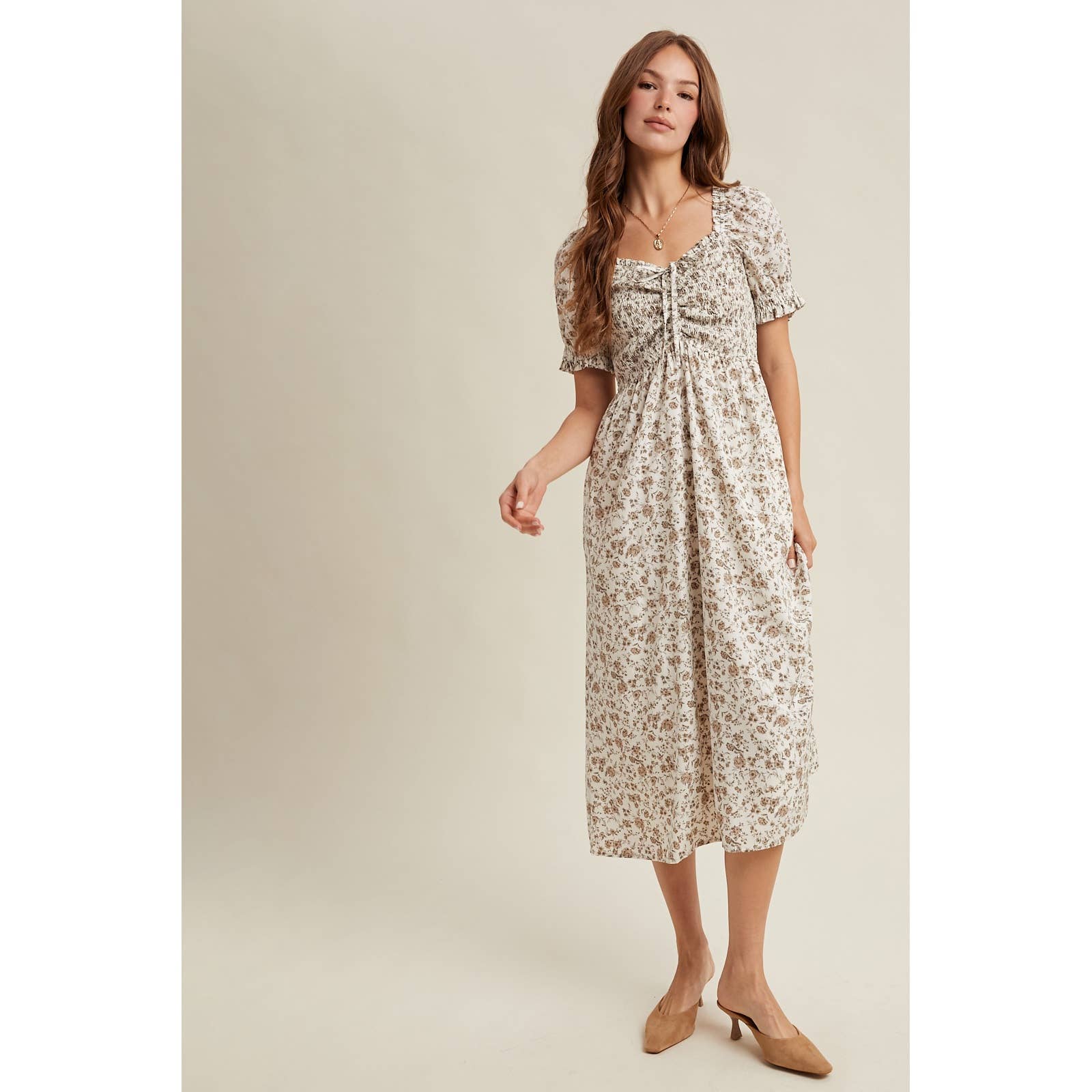 Embrace effortless elegance with this floral ruched midi dress, designed with a flattering fit and feminine ruching for a perfect blend of comfort and style.