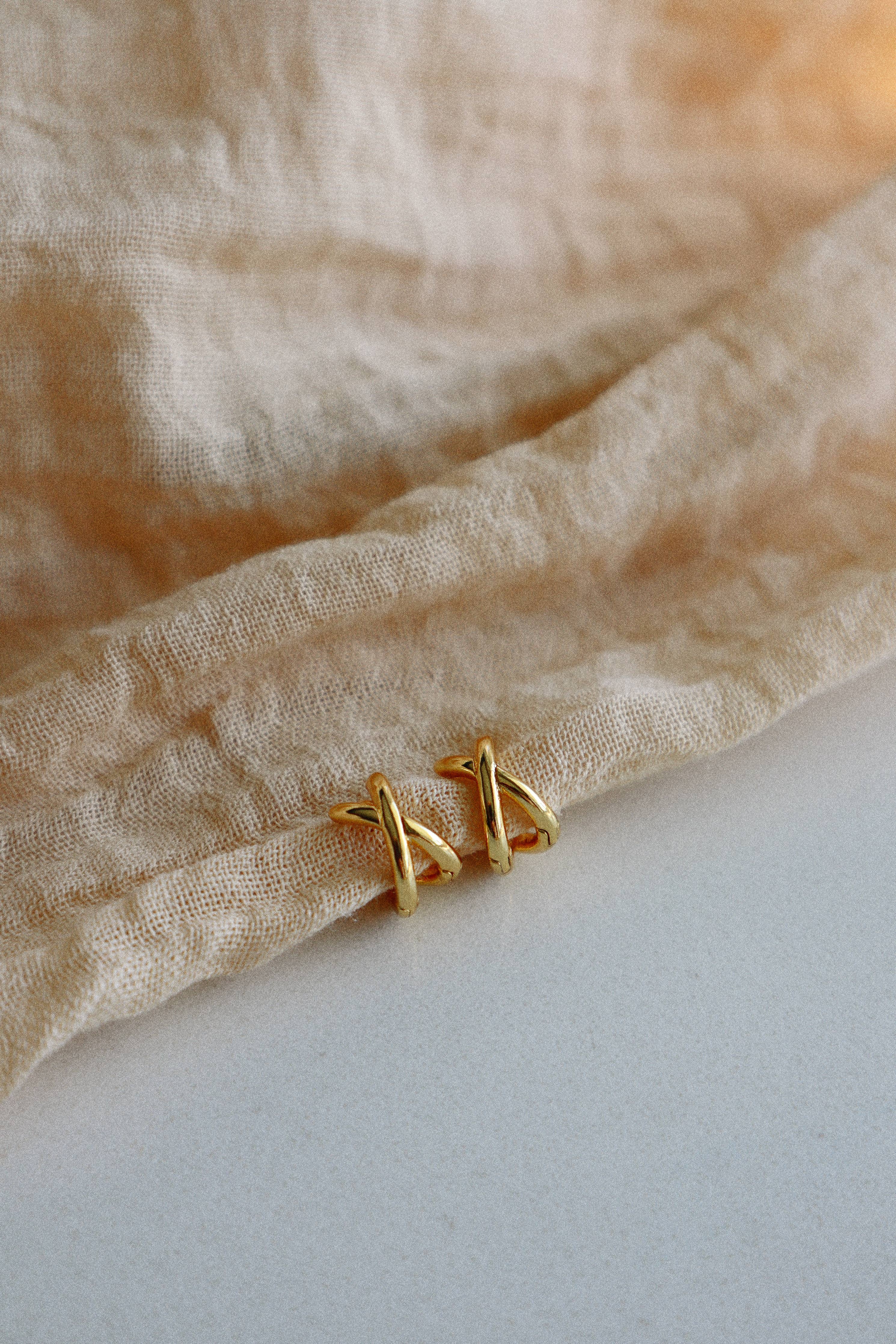 Minimal , dainty and perfect for every day. Gold plated mini Huggie hoop with a criss-cross design . 6 x 9.5 mm