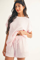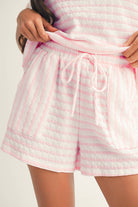 This playful pink and white striped short set features a textured fabric that adds a fun twist to your casual look. The drawstring shorts offer an adjustable fit, while convenient pockets keep your essentials close. Perfect for lounging or sunny days out, this set combines comfort and style effortlessly.