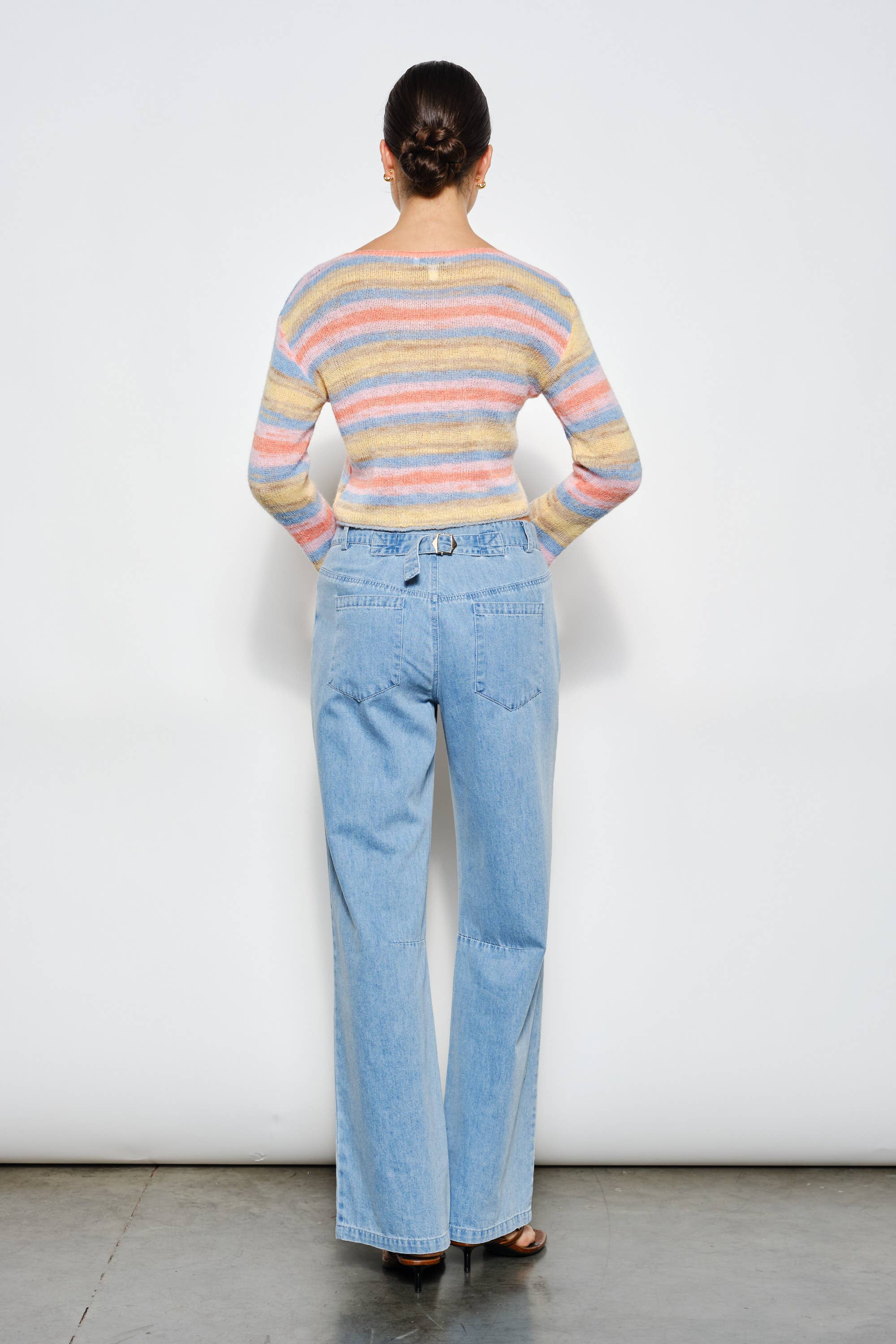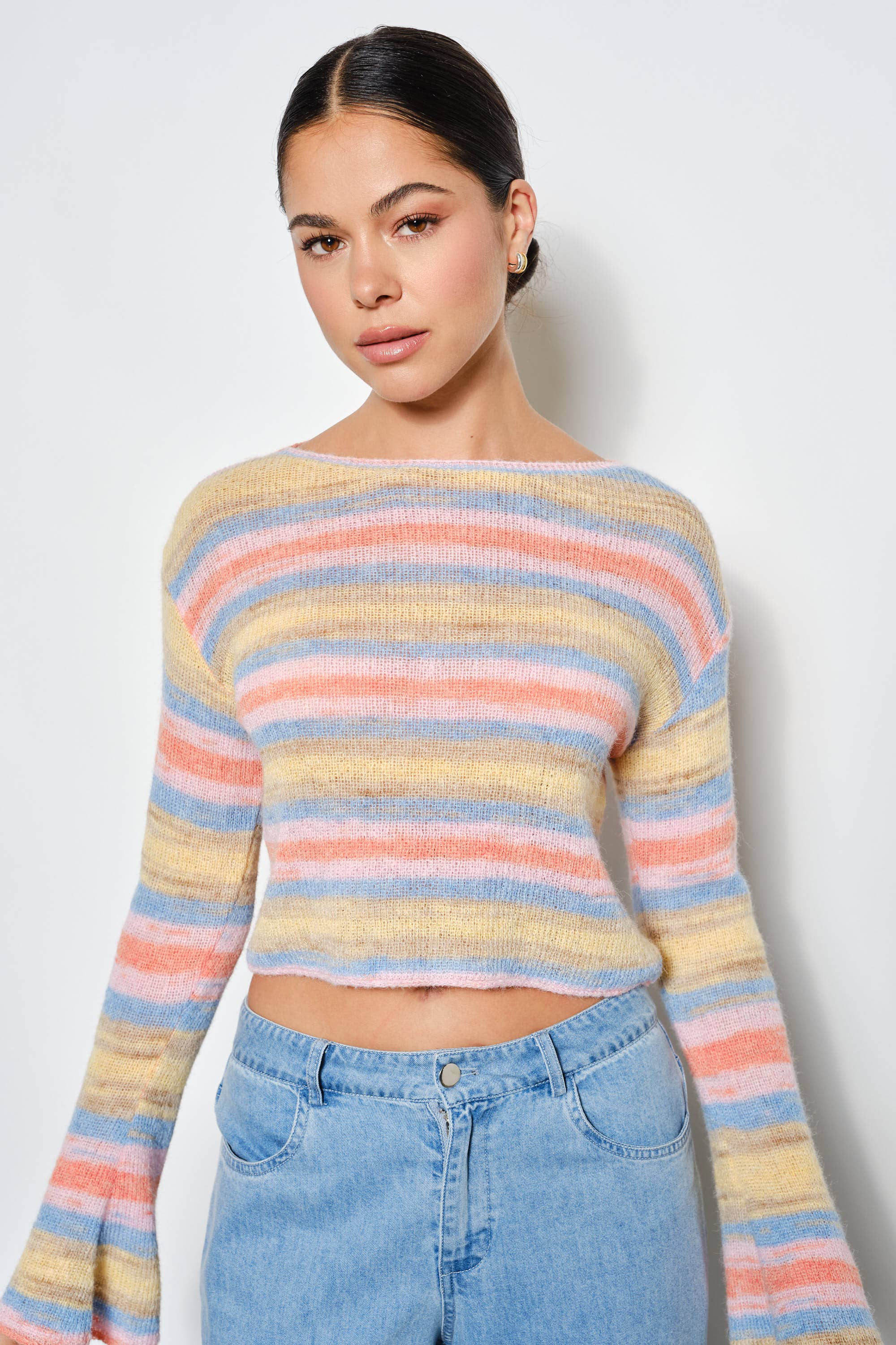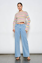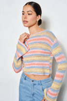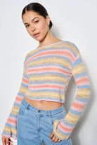 Striped knit sweater with a flattering boat neckline and semi-cropped silhouette. Crafted from a soft blend of nylon, polyester, acrylic, and wool, this lightweight layer delivers warmth without bulk. Long sleeves and modern styling make it perfect for effortless everyday wear.