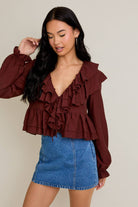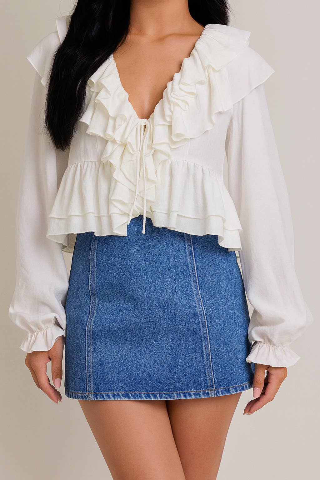 LONG SLEEVE V-NECK RUFFLE DETAIL CROP BLOUSE: White / S