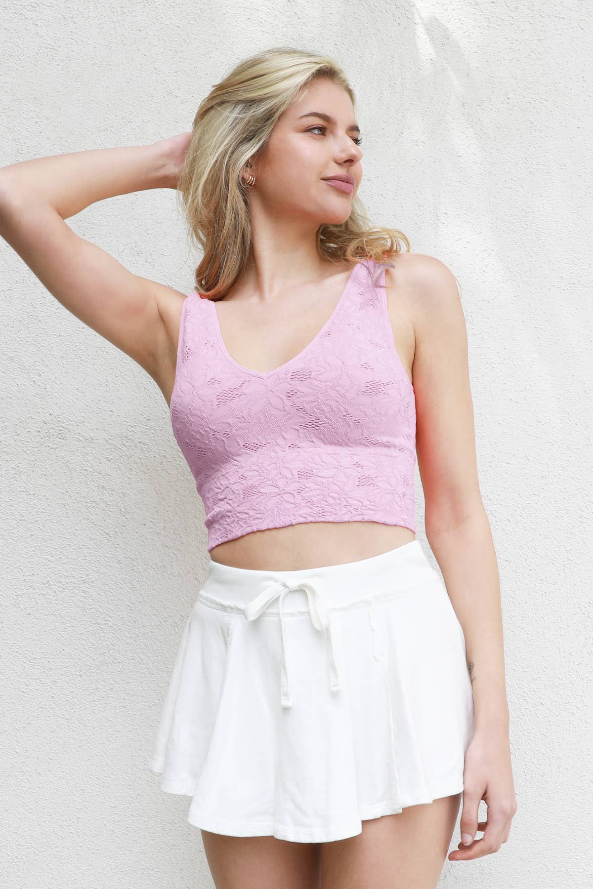 Lace tank top featuring a V - Neck line