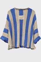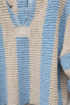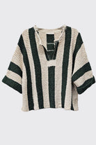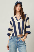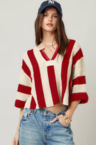 One of our best-selling sweaters, the vertical striped sweater features a loose, slouchy fit with a cropped length, vertical stripe design, V-neckline, 3/4 sleeves, and solid front and back patch detailing