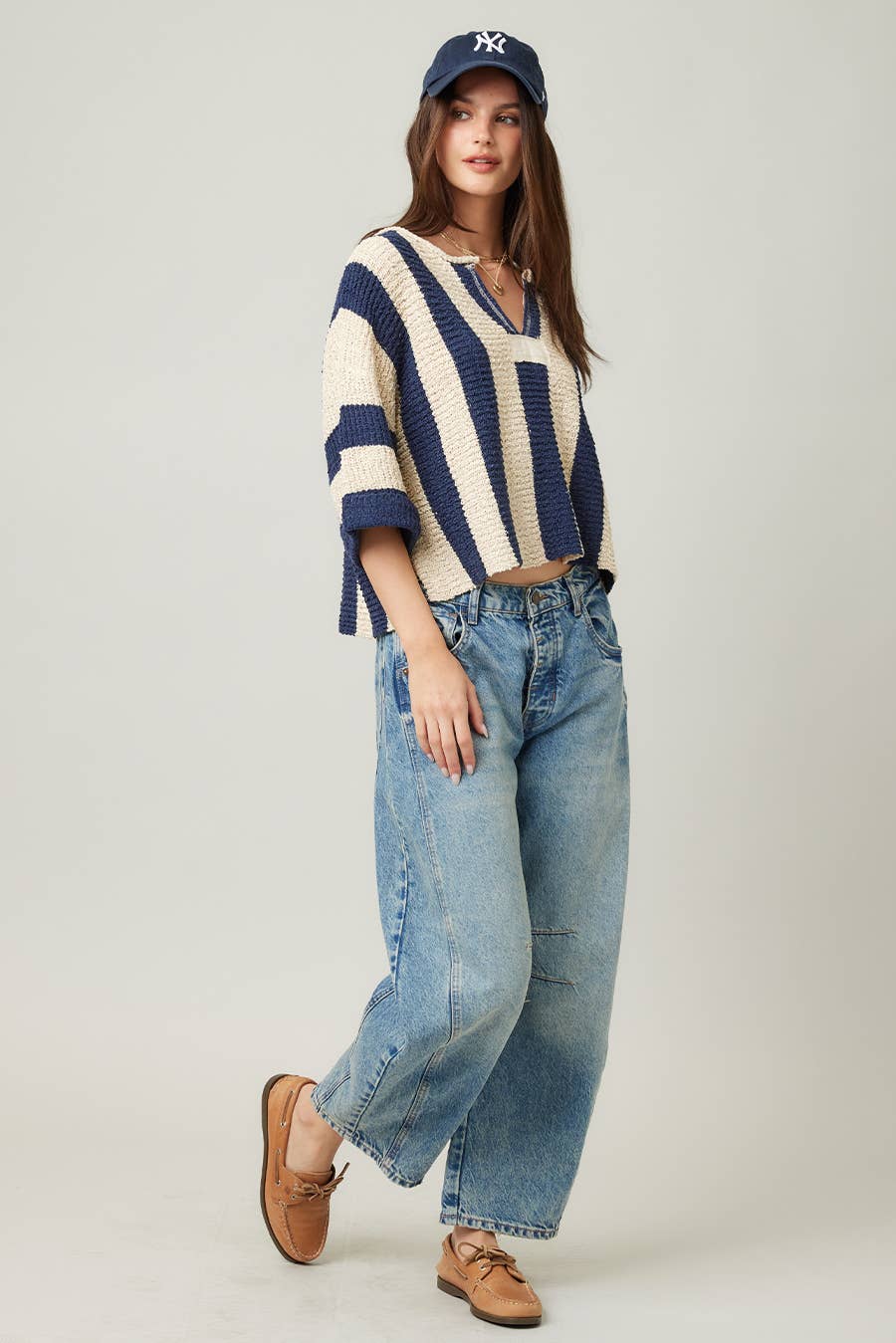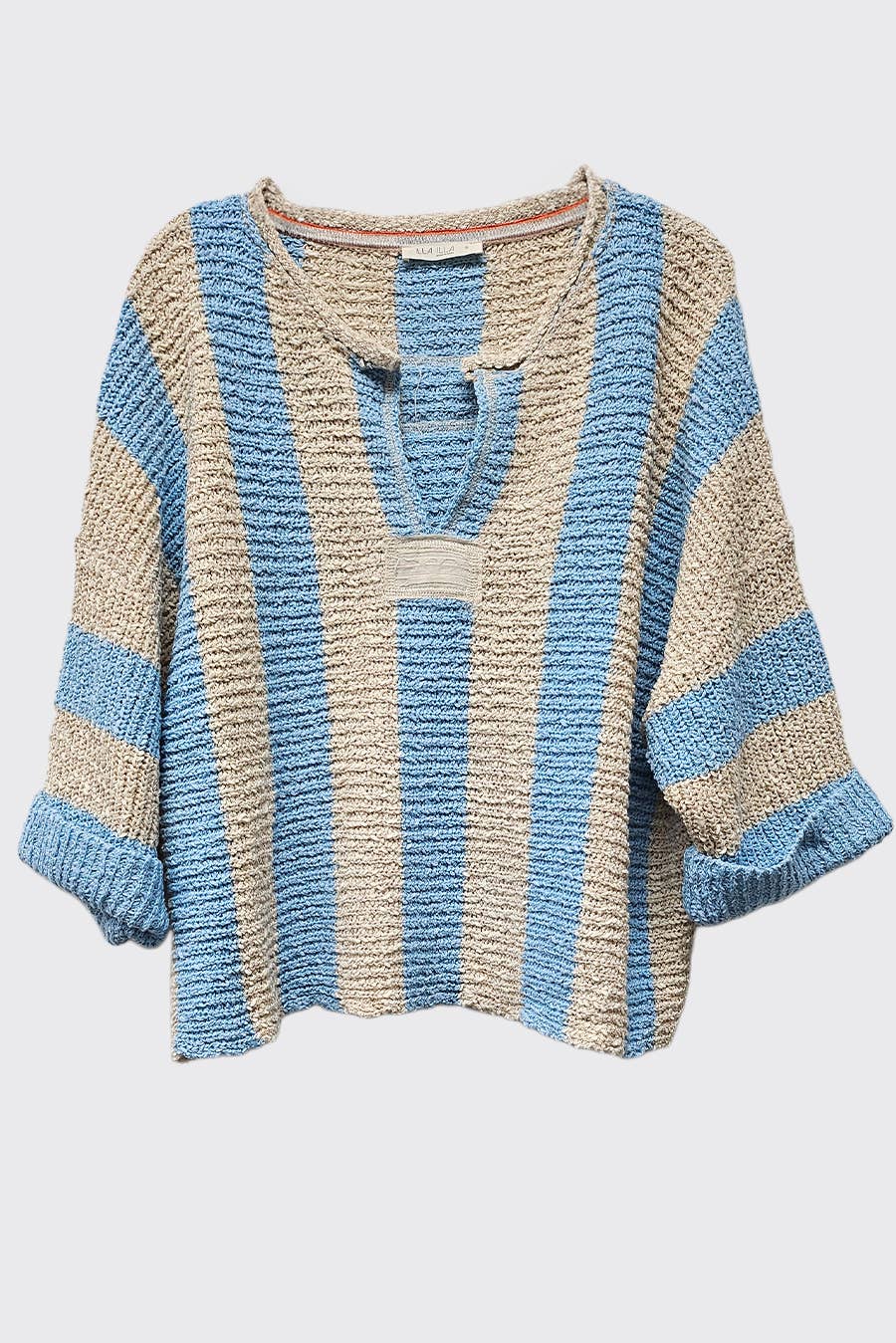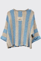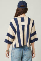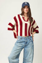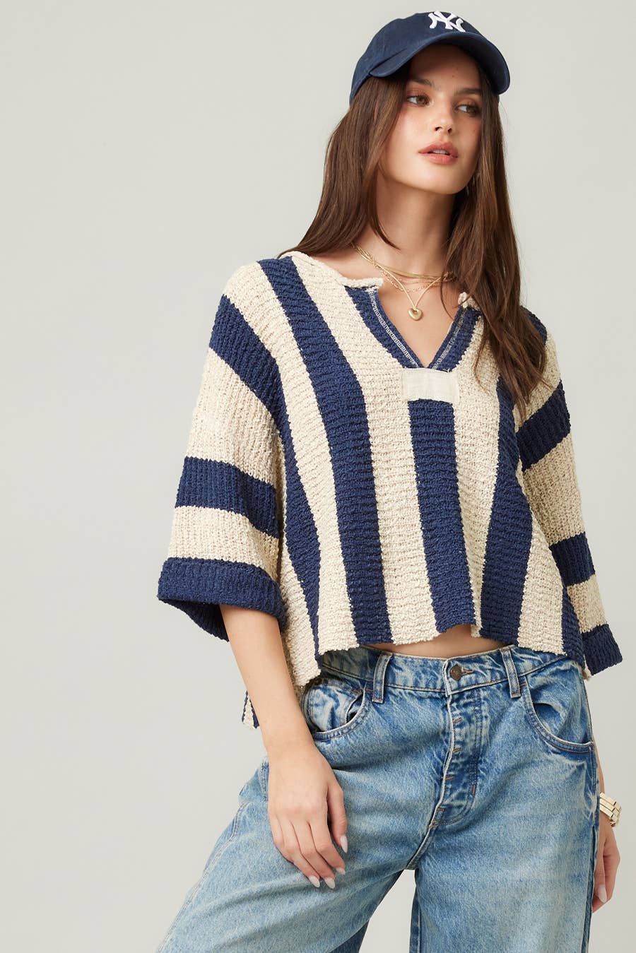 One of our best-selling sweaters, the vertical striped sweater features a loose, slouchy fit with a cropped length, vertical stripe design, V-neckline, 3/4 sleeves, and solid front and back patch detailing