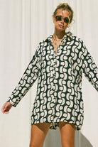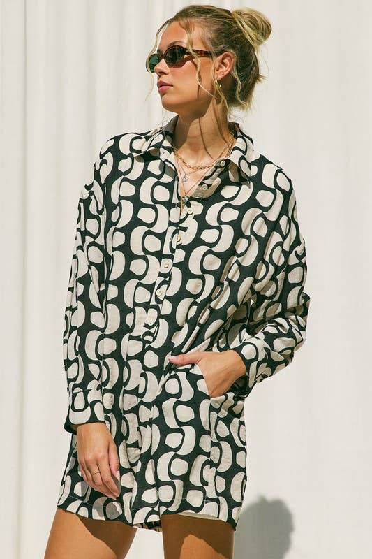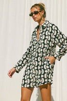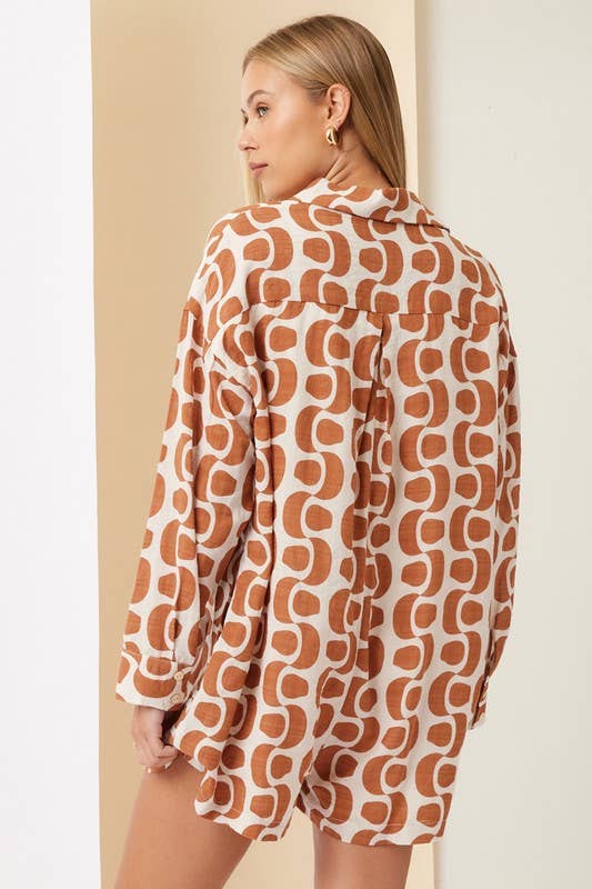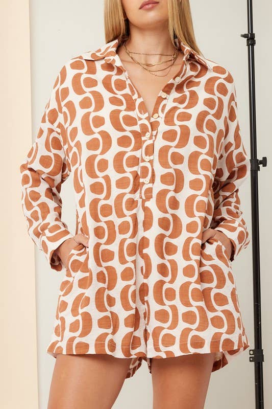 Printed Button Down Romper: Tobacco / M