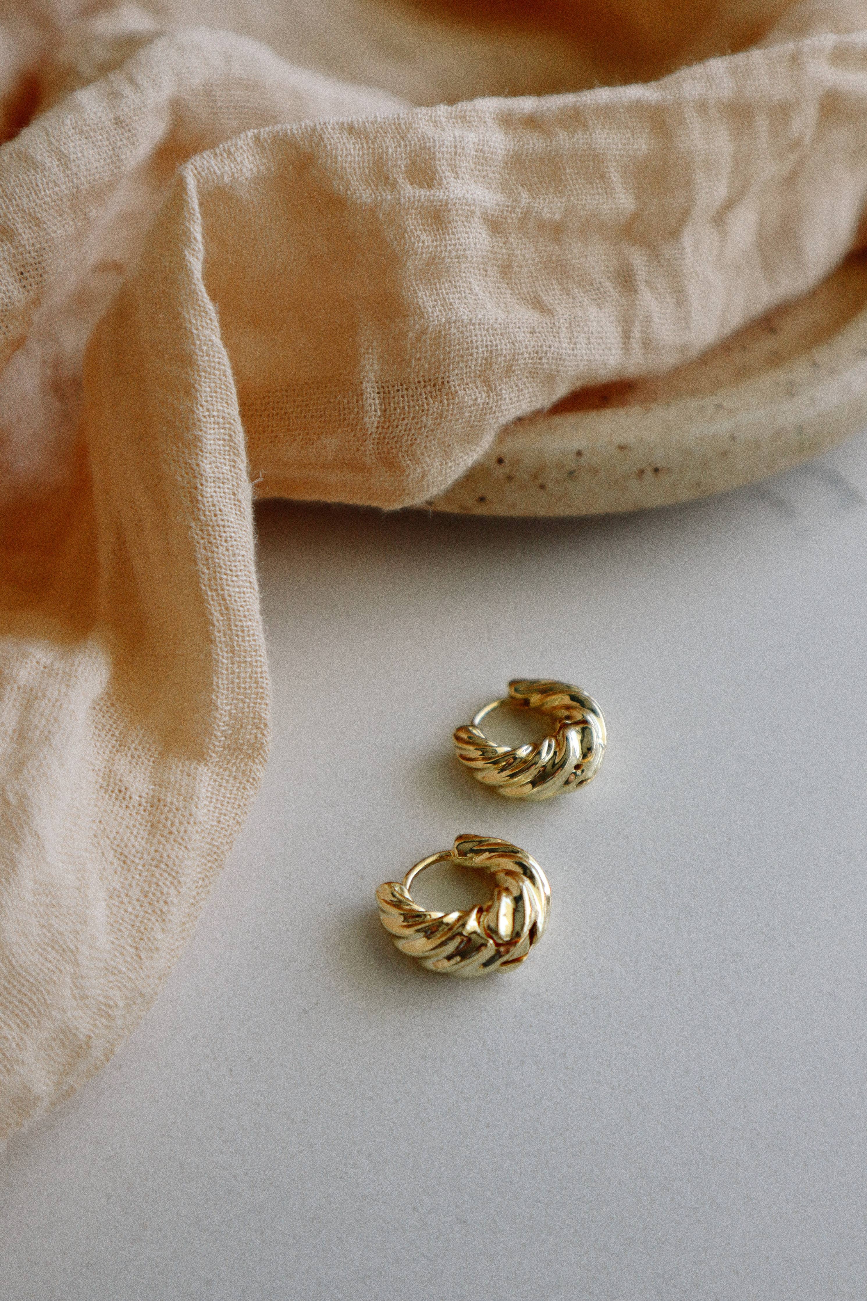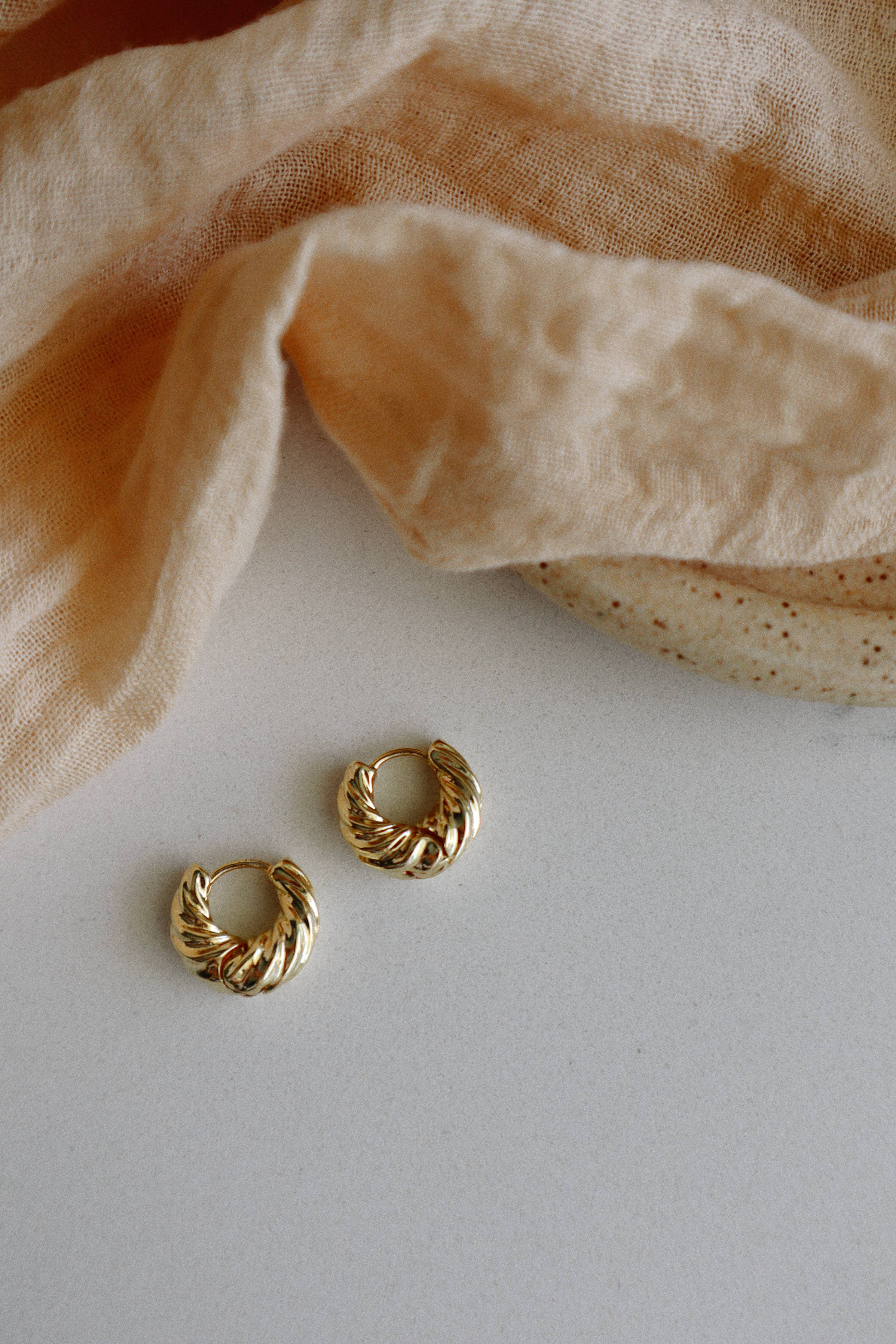 Perfect for everyday ; Pilates , market runs & everything in between . Dainty + delightful ribbed huggie hoops ; 14k gold plated silver. Lightweight.