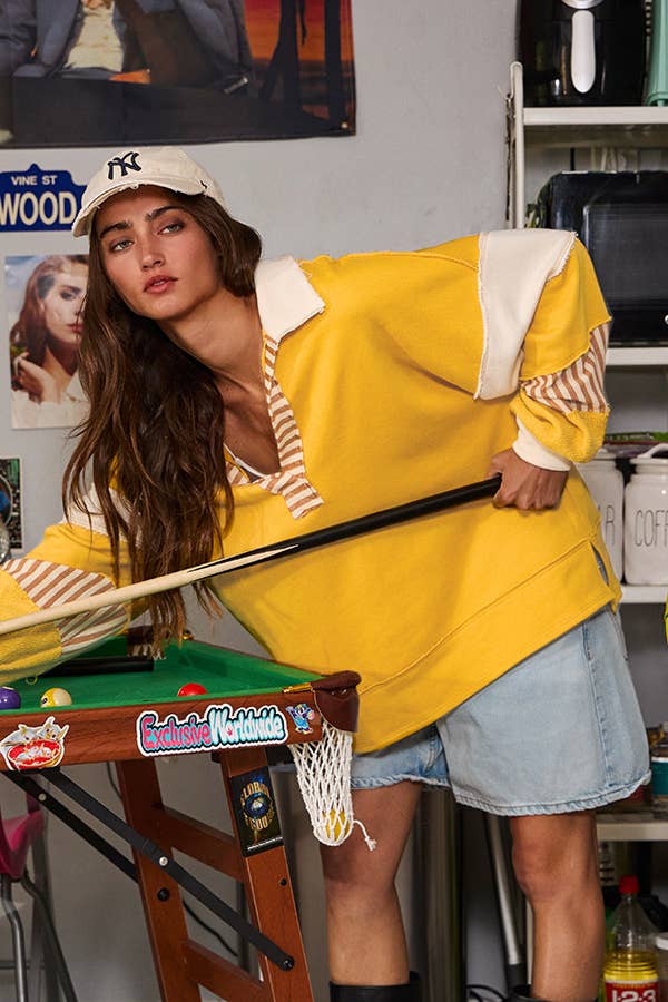 The perfect cozy yet chic pullover to wear all season long! This pullover features a contrast collared v-neckline, drop shoulder detail on long sleeves, ribbed cuffs, stitched details, oversized, and a ribbed hem. Grab this pullover to wear in class, or a chilly fall day!