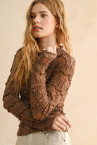 Elevate your everyday style with this charming lace textured long sleeve blouse. The delicate lace detailing adds a touch of sophistication and visual interest, while the long sleeves provide versatile coverage for any season. Perfect for dressing up or down, this piece transitions seamlessly from office to weekend plans. Our model (5'7½") showcases the size S beautifully, giving you a true sense of how it drapes and fits. Whether you're layering it under a blazer or wearing it solo, this blouse is your new go-to for effortless elegance with a hint of playful charm.