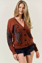 - Rustic terracotta-colored cardigan with striking tiger motif