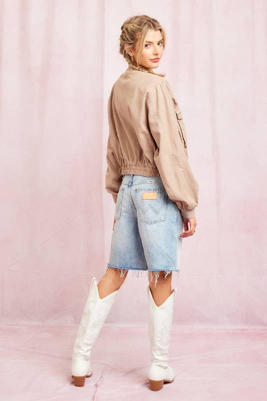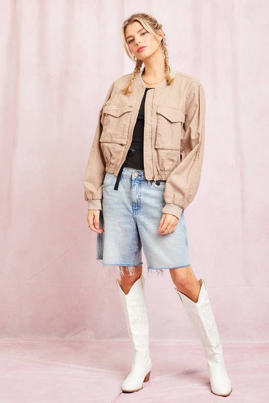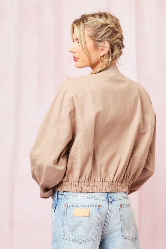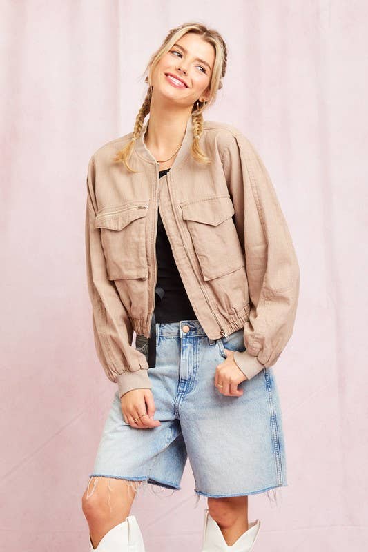 A washed linen fabric, bomber jacket that is cropped with flap patch pockets, metal zip closure, and ribbed neckline/cuffs.