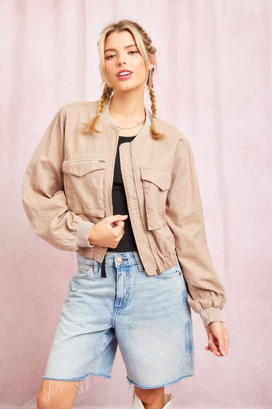 A washed linen fabric, bomber jacket that is cropped with flap patch pockets, metal zip closure, and ribbed neckline/cuffs.